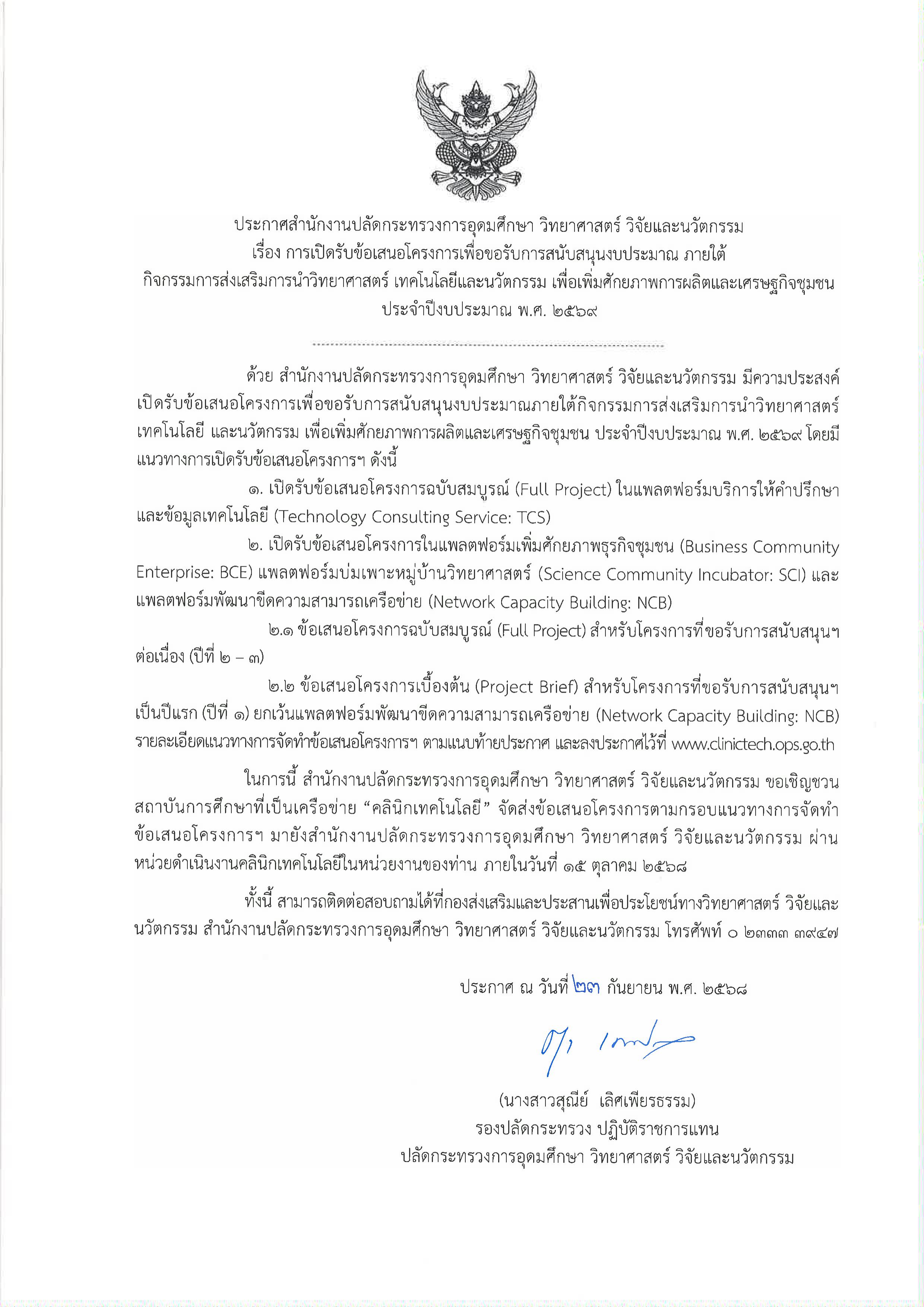 ตามที่ สำนักงานปลัดกระทรวงการอุดมศึกษา วิทยาศาสตร์ วิจัยและนวัตกรรม (สป.อว.) ภายใต้กิจกรรมการส่งเสริมการนำวิทยาศาสตร์เทคโนโลยีและนวัตกรรม เพื่อเพิ่มศักยภาพการผลิตและเศรษฐกิจชุมชน ประจำปีงบประมาณ พ.ศ. 2569 โดยมีรายละเอียดตามแนวทางการจัดทำข้อเสนอโครงการ ตามแนบท้ายประกาศ และลงประกาศไว้ที่ www.clinictech.ops.go.th นั้น โดยกำหนดให้หน่วยรับงบประมาณยื่นคำขอโครงการวิจัย/โครงการนวัตกรรม มายังสำนักงานปลัดกระทรวงการอุดมศึกษา วิทยาศาสตร์ วิจัยและนวัตกรรม นั้น
