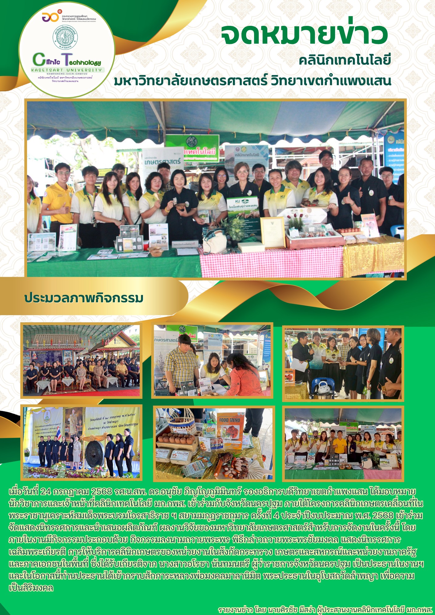 24 กรกฎาคม 2568 รศ.น.สพ. ดร.อนุชัย ภิญโญภูมิมินทร์ รองอธิการบดีวิทยาเขตกำแพงแสน ได้มอบหมาย นักวิชาการและเจ้าหน้าที่คลินิกเทคโนโลยี มก.กพส. เข้าร่วมกับจังหวัดนครปฐม ภายใต้โครงการคลินิกเกษตรเคลื่อนที่ใน พระราชานุเคราะห์สมเด็จพระบรมโอรสาธิราช ฯ สยามมกุฎราชกุมาร ครั้งที่ 4 ประจำปีงบประมาณ พ.ศ. 2568 เข้าร่วมจัดแสดงนิทรรศการและนำเสนอผลิตภัณฑ์ ผลงานวิจัยของมหาวิทยาลัยเกษตรศาสตร์สำหรับการจัดงานในครั้งนี้ โดยภายในงานมีกิจกรรมประกอบด้วย กิจกรรมลงนามถวายพระพร พิธีกล่าวถวายพระพรชัยมงคล แสดงนิทรรศการ เฉลิมพระเกียรติ การให้บริการคลินิกเกษตรของหน่วยงานในสังกัดกระทรวง เกษตรและสหกรณ์และหน่วยงานภาครัฐ และภาคเอกชนในพื้นที่ ซึ่งได้รับเกียรติจาก นางสาวอโรชา นันทมนตรี ผู้ว่าราชการจังหวัดนครปฐม เป็นประธานในงานฯ และในโอกาสนี้ท่านประธานได้เข้ากราบสักการะหลวงพ่อมงคลมาลานิมิต พระประธานในอุโบสถวัดลำพญา เพื่อความเป็นสิริมงคล