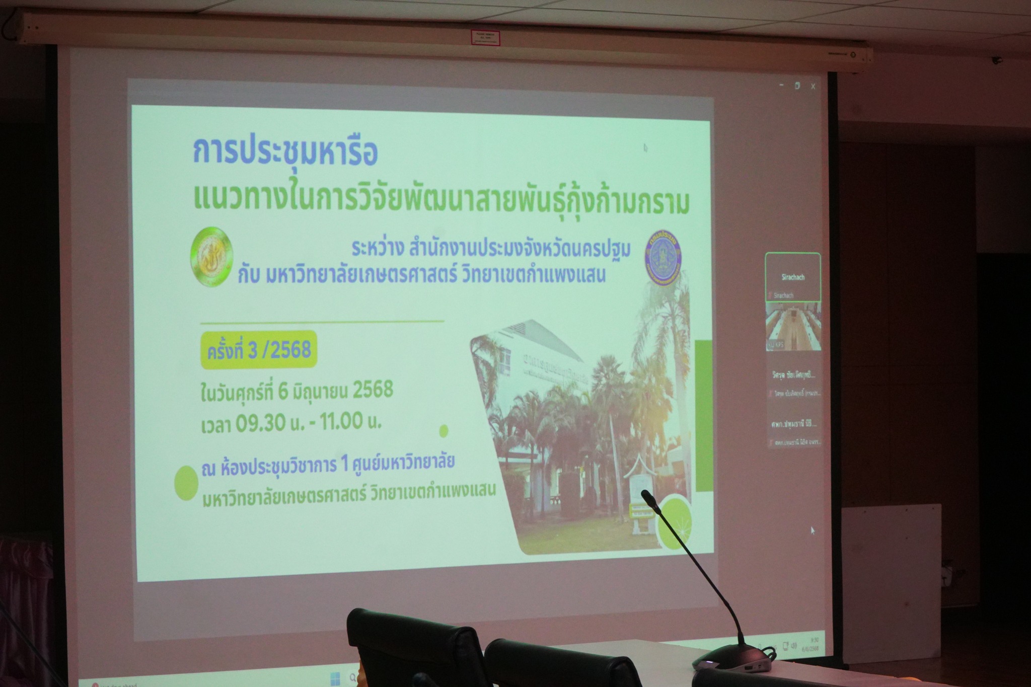 มหาวิทยาลัยเกษตรศาสตร์ วิทยาเขตกำแพงแสน โดย รองศาสตราจารย์ ดร.อนุชัย ภิญโญภูมิมินทร์ รองอธิการบดีวิทยาเขตกำแพงแสน พร้อมด้วย นายณัฐพงษ์ ปานขาว ผู้ช่วยคณบดีประจำวิทยาเขตกำแพงแสน คณะประมง และ รศ.น.สพ.ดร.วิศนุ บุญญาวิวัฒน์ ผศ.สพ.ญ.ดร.ธีรภรณ์ พูลพิพัฒน์ ภาควิชาเวชศาสตร์และทรัพยากรการผลิตสัตว์ คณะสัตวแพทย์ มหาวิทยาลัยเกษตรศาสตร์ ให้การต้อนรับ ผู้บริหารและผู้เชี่ยวชาญจาก สำนักงานประมงจังหวัดนครปฐม นำโดย เรือเอก วิรัตน์ อาจคงหาญ ประมงจังหวัดนครปฐม และกองวิจัยและพัฒนาพันธุกรรมสัตว์น้ำ โดย นายคงภพ อำพลศักดิ์ ผู้เชี่ยวชาญด้านพันธุกรรมสัตว์น้ำ และนางสาวชนิกานต์ โชติมา หัวหน้ากลุ่มวิชาการ ในโอกาสร่วมประชุมหารือแนวทางในการวิจัยพัฒนาสายพันธุ์กุ้งก้ามกราม ระหว่าง สำนักงานประมงจังหวัดนครปฐม กับ มหาวิทยาลัยเกษตรศาสตร์ วิทยาเขตกำแพงแสน ครั้งที่ 3/2568 เมื่อวันศุกร์ที่ 6 มิถุนายน 2568 ณ ห้องประชุมวิชาการ 1 ศูนย์มหาวิทยาลัย มหาวิทยาลัยเกษตรศาสตร์ วิทยาเขตกำแพงแสน ทั้งนี้การประชุมดังกล่าวจัดขึ้นเพื่อพิจารณาร่างแบบเสนอโครงการวิจัย (Research Project) ในการวิจัยพัฒนาสายพันธุ์กุ้งก้ามกราม สำหรับศูนย์วิจัยและพัฒนาพันธุกรรมกุ้งก้ามกรามนครปฐม