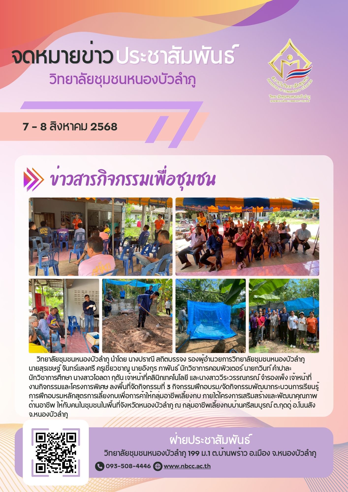วันที่ 7 - 8 สิงหาคม 2568 ที่ผ่านมา วิทยาลัยชุมชนหนองบัวลำภู นำโดย นางปราณี สถิตบรรจง รองผู้อำนวยการวิทยาลัยชุมชนหนองบัวลำภู นายสุรเชษฐ์ จันทร์แสงศรี ครูเชี่ยวชาญ นายอังกูร ภาพันธ์ นักวิชาการคอมพิวเตอร์ นายกวินท์ คำปาละ นักวิชาการศึกษา นางสาวไอลดา กุตัน เจ้าหน้าที่คลินิกเทคโนโลยี และนางสาววีระวรรณภรณ์ จำรองเพ็ง เจ้าหน้าที่งานกิจกรรม และโครงการพิเศษ ลงพื้นที่จัดกิจกรรมที่ 3 กิจกรรมฝึกอบรม/จัดกิจกรรมพัฒนากระบวนการเรียนรู้ การฝึกอบรมหลักสูตรการเลี้ยงกบเพื่อการค้าให้กลุ่มอาชีพเลี้ยงกบ ภายใต้โครงการเสริมสร้างและพัฒนาคุณภาพ ด้านอาชีพ ให้กับคนในชุมชนในพื้นที่จังหวัดหนองบัวลำภู ณ กลุ่มอาชีพเลี้ยงกบบ้านศรีสมบูรณ์ ต.กุดดู่ อ.โนนสัง จ.หนองบัวลำภู รายงานโดย นางสาวไอลดา กุตัน วันที่รายงาน 18/09/2568 [19994] |