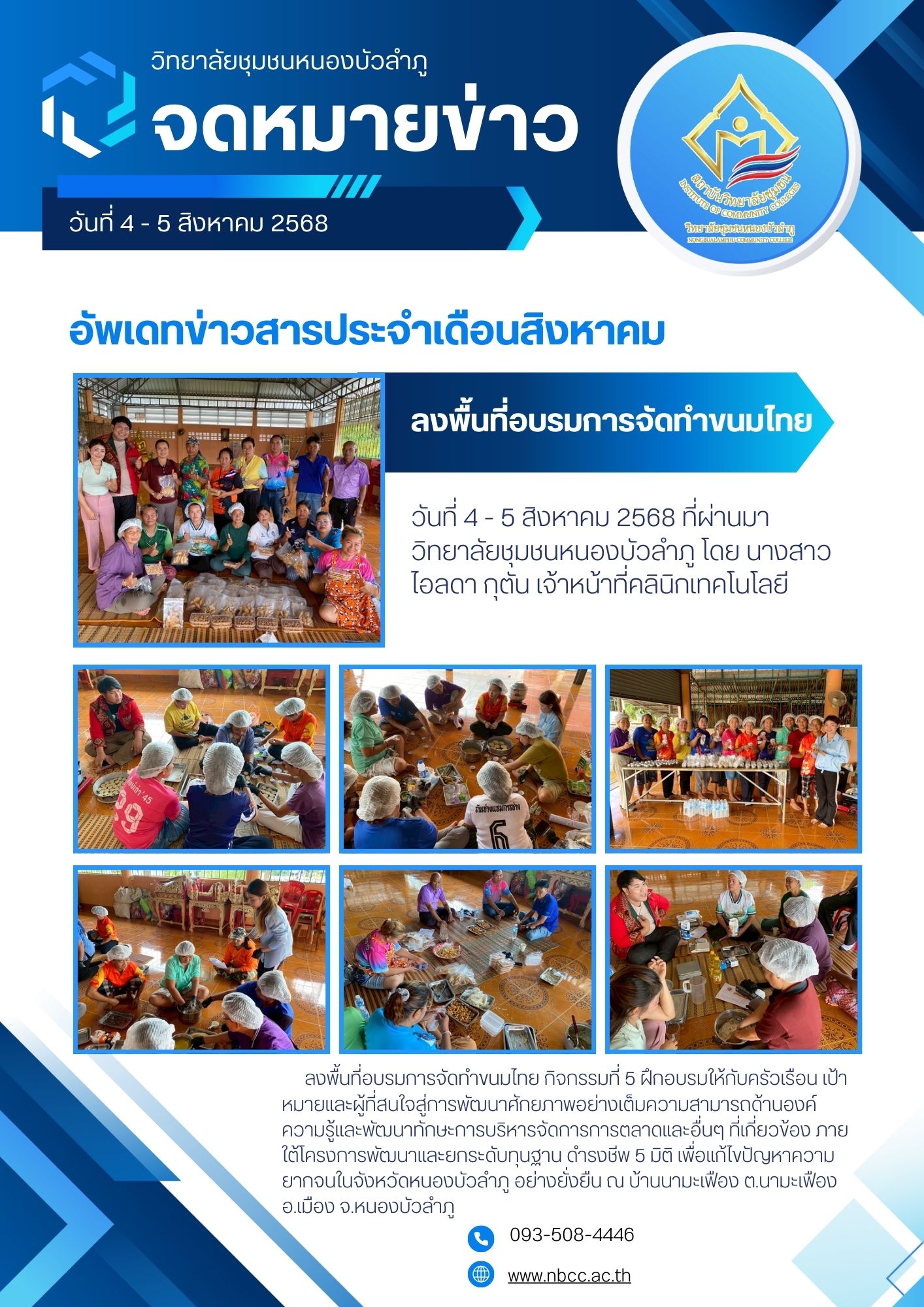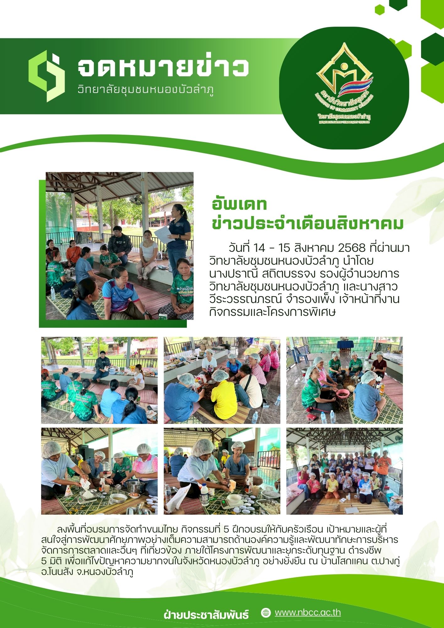 วันที่ 4 - 5 สิงหาคม 2568 ที่ผ่านมา วิทยาลัยชุมชนหนองบัวลำภู โดย นางสาวไอลดา กุตัน เจ้าหน้าที่คลินิกเทคโนโลยี ลงพื้นที่อบรมการจัดทำขนมไทย กิจกรรมที่ 5 ฝึกอบรมให้กับครัวเรือน เป้าหมายและผู้ที่สนใจสู่การพัฒนาศักยภาพอย่างเต็มความสามารถด้านองค์ความรู้และพัฒนาทักษะการบริหารจัดการการตลาดและอื่นๆ ที่เกี่ยวข้อง ภายใต้โครงการพัฒนาและยกระดับทุนฐาน ดำรงชีพ 5 มิติ เพื่อแก้ไขปัญหาความยากจนในจังหวัดหนองบัวลำภู อย่างยั่งยืน ณ บ้านนามะเฟือง ต.นามะเฟือง อ.เมือง จ.หนองบัวลำภู รายงานโดย นางสาวไอลดา กุตัน วันที่รายงาน 18/09/2568 [20004] |