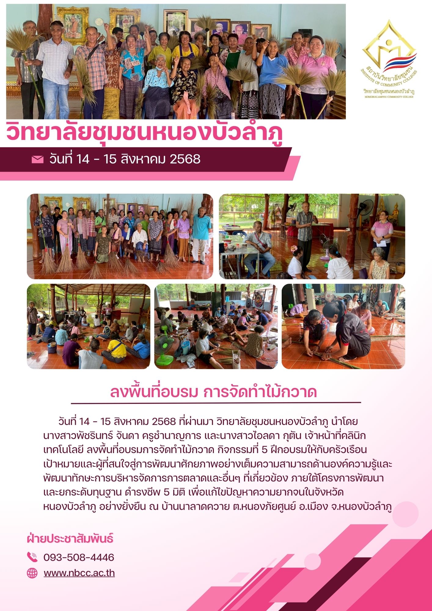 วันที่ 4 - 5 สิงหาคม 2568 ที่ผ่านมา วิทยาลัยชุมชนหนองบัวลำภู โดย นายกวินท์ คำปาละ นักวิชาการศึกษา ลงพื้นที่อบรมการจัดทำไม้กวาด กิจกรรมที่ 5 ฝึกอบรมให้กับครัวเรือน เป้าหมายและผู้ที่สนใจสู่การพัฒนาศักยภาพอย่างเต็มความสามารถด้านองค์ความรู้และพัฒนาทักษะการบริหารจัดการการตลาดและอื่นๆ ที่เกี่ยวข้อง ภายใต้โครงการพัฒนาและยกระดับทุนฐาน ดำรงชีพ 5 มิติ เพื่อแก้ไขปัญหาความยากจนในจังหวัดหนองบัวลำภู อย่างยั่งยืน ณ บ้านใหม่โพธิ์ทอง บ้านโคกกลาง บ้านบุ่งบก ต.ป่าไม้งาม อ.เมือง จ.หนองบัวลำภู รายงานโดย นางสาวไอลดา กุตัน วันที่รายงาน 18/09/2568 [19998] |