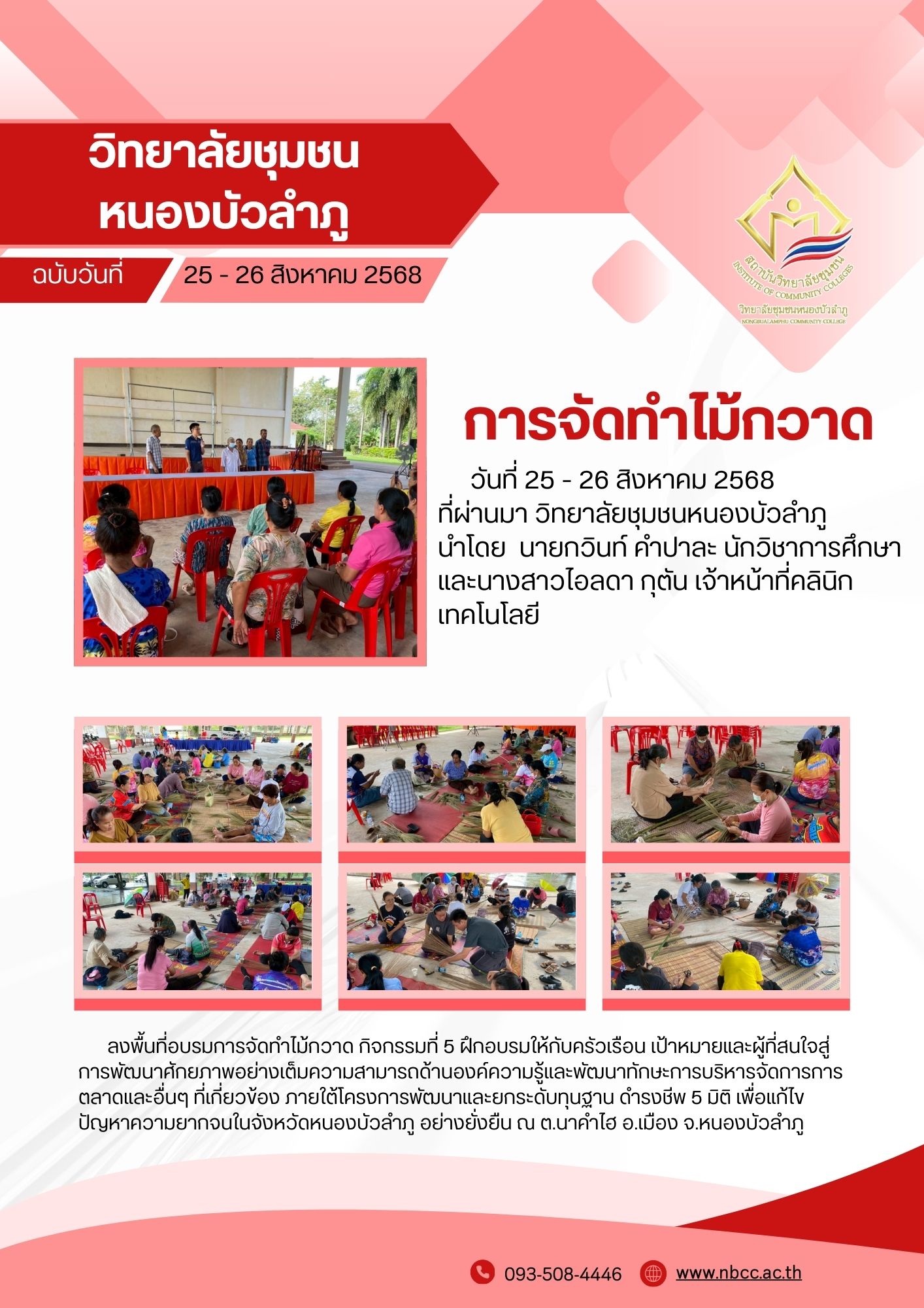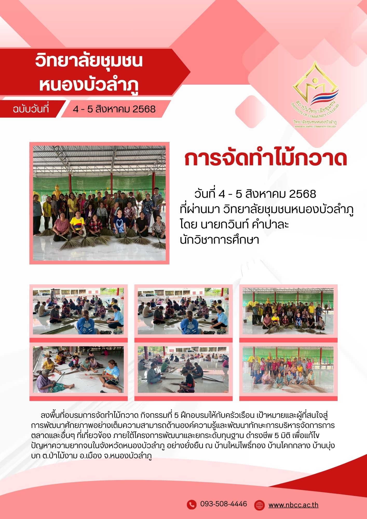 วันที่ 4 - 5 สิงหาคม 2568 ที่ผ่านมา วิทยาลัยชุมชนหนองบัวลำภู โดย นายกวินท์ คำปาละ นักวิชาการศึกษา ลงพื้นที่อบรมการจัดทำไม้กวาด กิจกรรมที่ 5 ฝึกอบรมให้กับครัวเรือน เป้าหมายและผู้ที่สนใจสู่การพัฒนาศักยภาพอย่างเต็มความสามารถด้านองค์ความรู้และพัฒนาทักษะการบริหารจัดการการตลาดและอื่นๆ ที่เกี่ยวข้อง ภายใต้โครงการพัฒนาและยกระดับทุนฐาน ดำรงชีพ 5 มิติ เพื่อแก้ไขปัญหาความยากจนในจังหวัดหนองบัวลำภู อย่างยั่งยืน ณ บ้านใหม่โพธิ์ทอง บ้านโคกกลาง บ้านบุ่งบก ต.ป่าไม้งาม อ.เมือง จ.หนองบัวลำภู รายงานโดย นางสาวไอลดา กุตัน วันที่รายงาน 18/09/2568 [19997] |