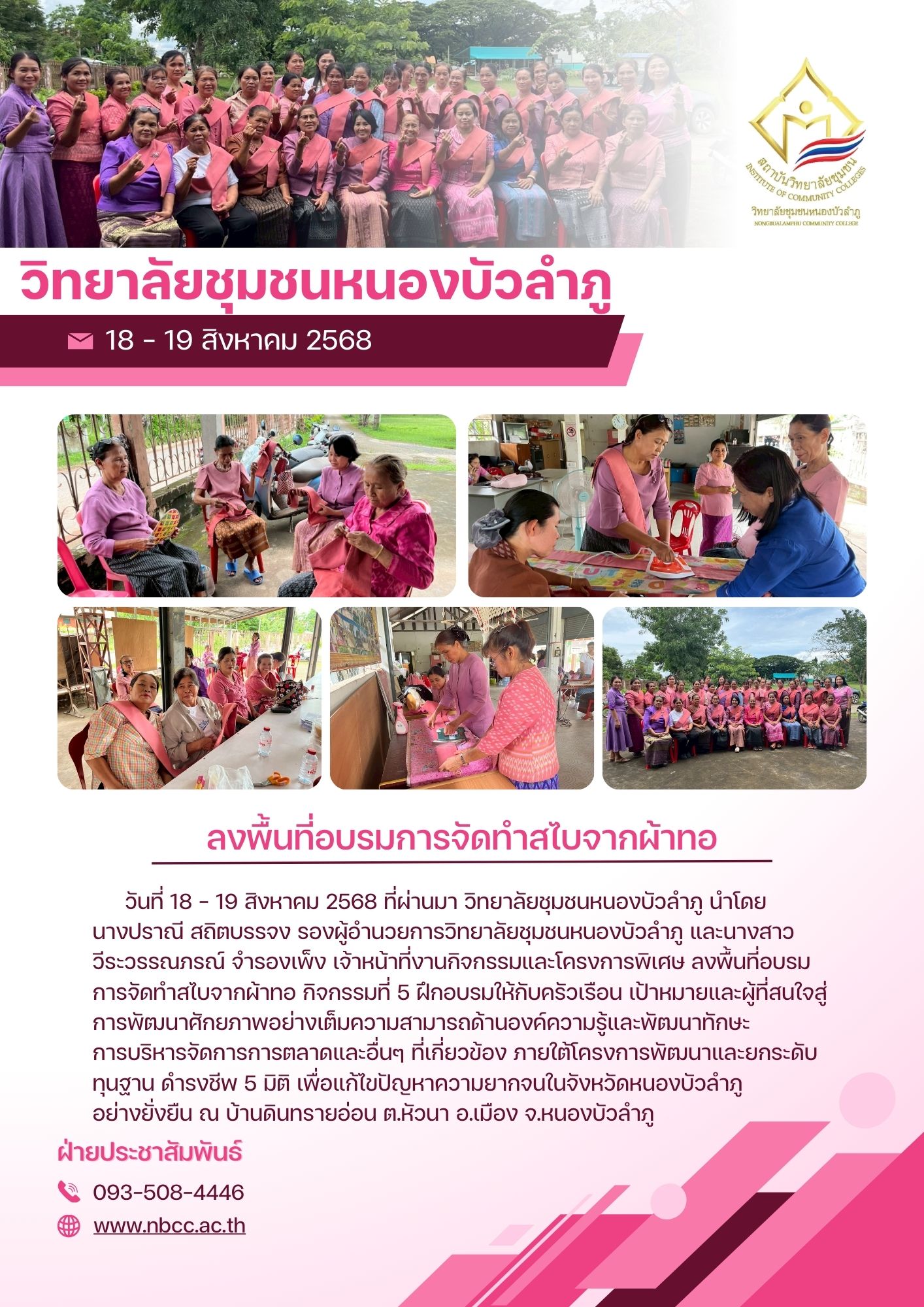 วันที่ 18 – 19 สิงหาคม 2568 ที่ผ่านมา วิทยาลัยชุมชนหนองบัวลำภู นำโดย นางปราณี สถิตบรรจง รองผู้อำนวยการวิทยาลัยชุมชนหนองบัวลำภู และนางสาววีระวรรณภรณ์ จำรองเพ็ง เจ้าหน้าที่งานกิจกรรมและโครงการพิเศษ ลงพื้นที่อบรมการจัดทำสไบจากผ้าทอ กิจกรรมที่ 5 ฝึกอบรมให้กับครัวเรือน เป้าหมายและผู้ที่สนใจสู่การพัฒนาศักยภาพอย่างเต็มความสามารถด้านองค์ความรู้และพัฒนาทักษะ การบริหารจัดการการตลาดและอื่นๆ ที่เกี่ยวข้อง ภายใต้โครงการพัฒนาและยกระดับทุนฐาน ดำรงชีพ 5 มิติ เพื่อแก้ไขปัญหาความยากจนในจังหวัดหนองบัวลำภู อย่างยั่งยืน ณ บ้านดินทรายอ่อน ต.หัวนา อ.เมือง จ.หนองบัวลำภู รายงานโดย นางสาวไอลดา กุตัน วันที่รายงาน 18/09/2568 [19999] |