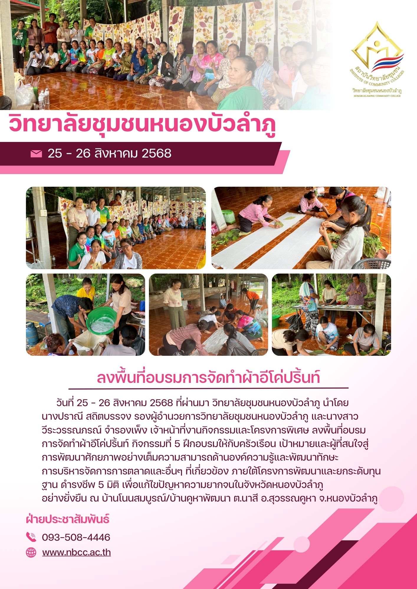 วันที่ 25 - 26 สิงหาคม 2568 ที่ผ่านมา วิทยาลัยชุมชนหนองบัวลำภู นำโดย นางปราณี สถิตบรรจง รองผู้อำนวยการวิทยาลัยชุมชนหนองบัวลำภู และนางสาววีระวรรณภรณ์ จำรองเพ็ง เจ้าหน้าที่งานกิจกรรมและโครงการพิเศษ ลงพื้นที่อบรมการจัดทำผ้าอีโค่ปริ้นท์ กิจกรรมที่ 5 ฝึกอบรมให้กับครัวเรือน เป้าหมายและผู้ที่สนใจสู่การพัฒนาศักยภาพอย่างเต็มความสามารถด้านองค์ความรู้และพัฒนาทักษะ การบริหารจัดการการตลาดและอื่นๆ ที่เกี่ยวข้อง ภายใต้โครงการพัฒนาและยกระดับทุนฐาน ดำรงชีพ 5 มิติ เพื่อแก้ไขปัญหาความยากจนในจังหวัดหนองบัวลำภู อย่างยั่งยืน ณ บ้านโนนสมบูรณ์/บ้านคูหาพัฒนา ต.นาสี อ.สุวรรณคูหา จ.หนองบัวลำภู รายงานโดย นางสาวไอลดา กุตัน วันที่รายงาน 18/09/2568 [20001] |