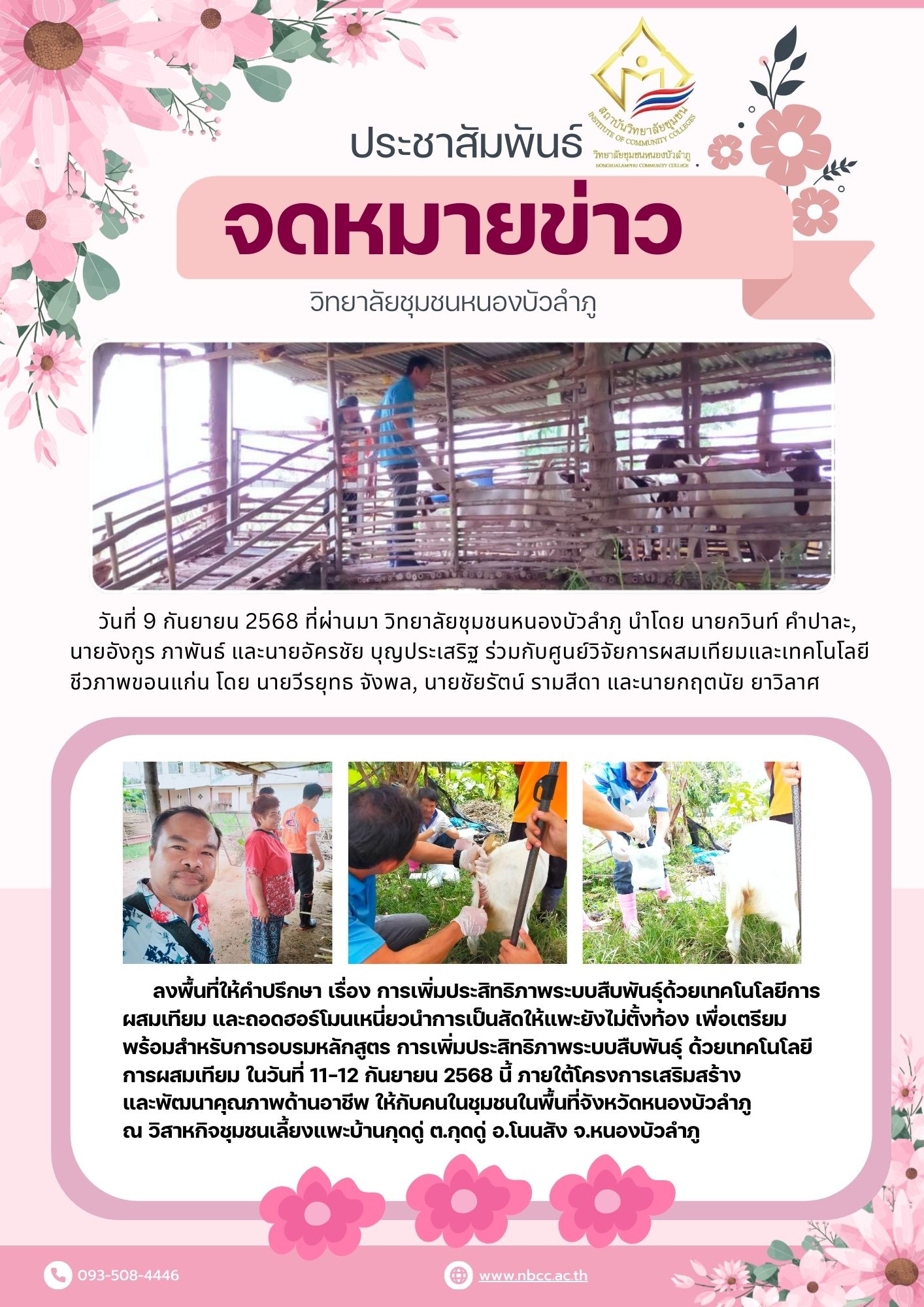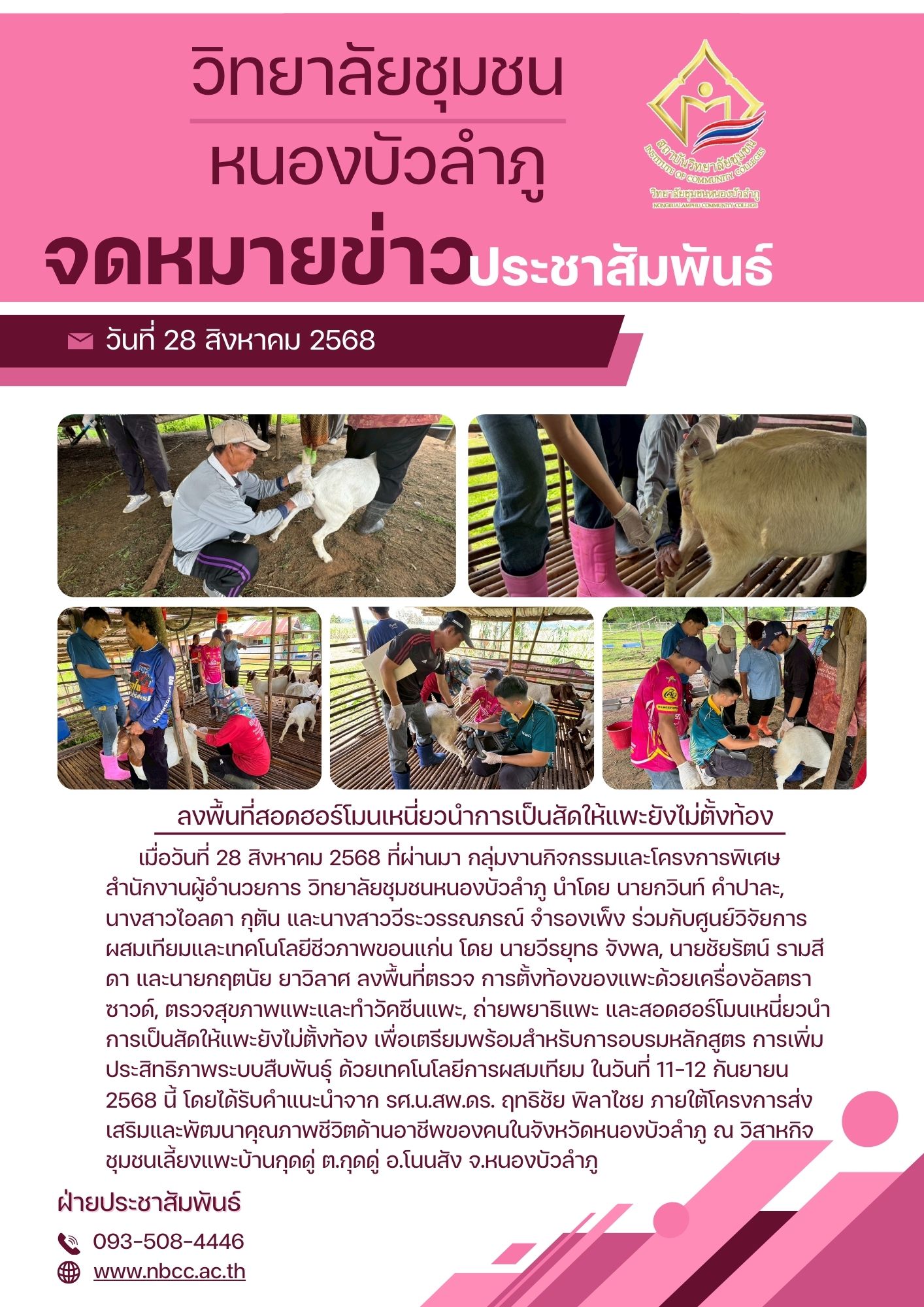 วันที่ 11 - 12 กันยายน 2568 ที่ผ่านมา นางสาวพัชรนันท์ วงค์พนัสสัก ผู้อำนวยการวิทยาลัยชุมชนหนองบัวลำภู มอบหมายให้ นางเวฬุกานต์ ขานวงศ์ รองผู้อำนวยการวิทยาลัยชุมชนหนองบัวลำภู เป็นประธานในพิธีเปิดงาน โดยนำบุคลากร นายสุรเชษฐ์ จันทร์แสงศรี ครูเชี่ยวชาญ นายอังกูร ภาพันธ์ นักวิชาการคอมพิวเตอร์ นายกวินท์ คำปาละ นักวิชาการศึกษา นางสาวไอลดา กุตัน เจ้าหน้าที่คลินิกเทคโนโลยี และนางสาววีระวรรณภรณ์ จำรองเพ็ง เจ้าหน้าที่งานกิจกรรมและโครงการพิเศษ จัดกิจกรรมการฝึกอบรมหลักสูตร การเพิ่มประสิทธิภาพระบบสืบพันธุ์แพะด้วยเทคโนโลยีการผสมเทียม ภายใต้โครงการเสริมสร้างและพัฒนาคุณภาพ ด้านอาชีพ ให้กับคนในชุมชนในพื้นที่จังหวัดหนองบัวลำภู โดยได้รับความอนุเคราะห์วิทยากรภาคบรรยายจาก มหาวิทยาลัยราชภัฏอุดรธานี โดย รศ.น.สพ.ดร.ฤทธิชัย พิลาไชย, ผศ.น.สพ.ดร.ธีระกุล นิลนนท์ และได้รับความอนุเคราะห์วิทยากรภาคปฏิบัติจากศูนย์วิจัยการผสมเทียมและเทคโนโลยีชีวภาพขอนแก่น โดย นายวีรยุทธ จังพล, นายชัยรัตน์ รามสีดา และนายกฤตนัย ยาวิลาศ ณ วิสาหกิจชุมชนเลี้ยงแพะบ้านกุดดู่ ต.กุดดู่ อ.โนนสัง จ.หนองบัวลำภู รายงานโดย นางสาวไอลดา กุตัน วันที่รายงาน 18/09/2568 [20010] |
