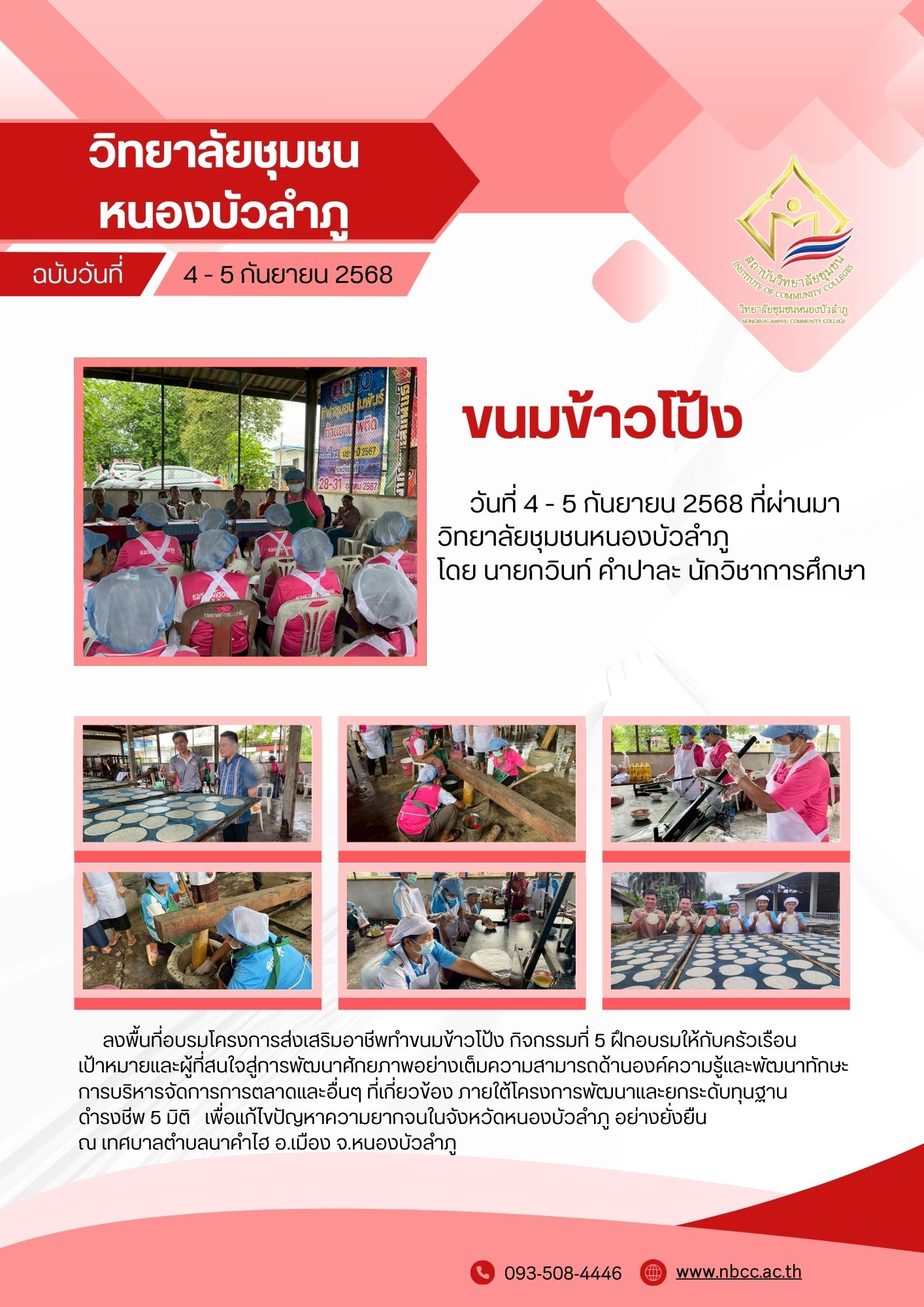 วันที่ 4 - 5 กันยายน 2568 ที่ผ่านมา วิทยาลัยชุมชนหนองบัวลำภู โดย นายกวินท์ คำปาละ นักวิชาการศึกษา ลงพื้นที่อบรมโครงการส่งเสริมอาชีพทำขนมข้าวโป้ง กิจกรรมที่ 5 ฝึกอบรมให้กับครัวเรือน เป้าหมายและผู้ที่สนใจสู่การพัฒนาศักยภาพอย่างเต็มความสามารถด้านองค์ความรู้และพัฒนาทักษะ การบริหารจัดการการตลาดและอื่นๆ ที่เกี่ยวข้อง ภายใต้โครงการพัฒนาและยกระดับทุนฐาน ดำรงชีพ 5 มิติ เพื่อแก้ไขปัญหาความยากจนในจังหวัดหนองบัวลำภู อย่างยั่งยืน ณ เทศบาลตำบลนาคำไฮ อ.เมือง จ.หนองบัวลำภู รายงานโดย นางสาวไอลดา กุตัน วันที่รายงาน 18/09/2568 [20003] |