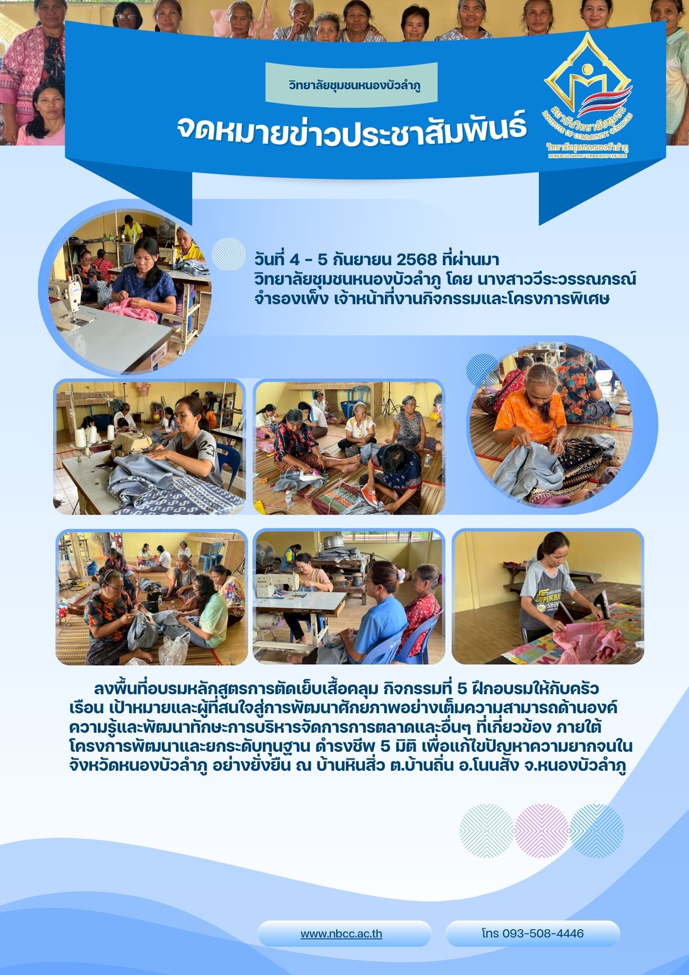 วันที่ 4 - 5 กันยายน 2568 ที่ผ่านมา วิทยาลัยชุมชนหนองบัวลำภู โดย นางสาววีระวรรณภรณ์ จำรองเพ็ง เจ้าหน้าที่งานกิจกรรมและโครงการพิเศษ ลงพื้นที่อบรมหลักสูตรการตัดเย็บเสื้อคลุม กิจกรรมที่ 5 ฝึกอบรมให้กับครัวเรือน เป้าหมายและผู้ที่สนใจสู่การพัฒนาศักยภาพอย่างเต็มความสามารถด้านองค์ความรู้และพัฒนาทักษะการบริหารจัดการการตลาดและอื่นๆ ที่เกี่ยวข้อง ภายใต้โครงการพัฒนาและยกระดับทุนฐาน ดำรงชีพ 5 มิติ เพื่อแก้ไขปัญหาความยากจนในจังหวัดหนองบัวลำภู อย่างยั่งยืน ณ บ้านหินสิ่ว ต.บ้านถิ่น อ.โนนสัง จ.หนองบัวลำภู รายงานโดย นางสาวไอลดา กุตัน วันที่รายงาน 18/09/2568 [20005] |