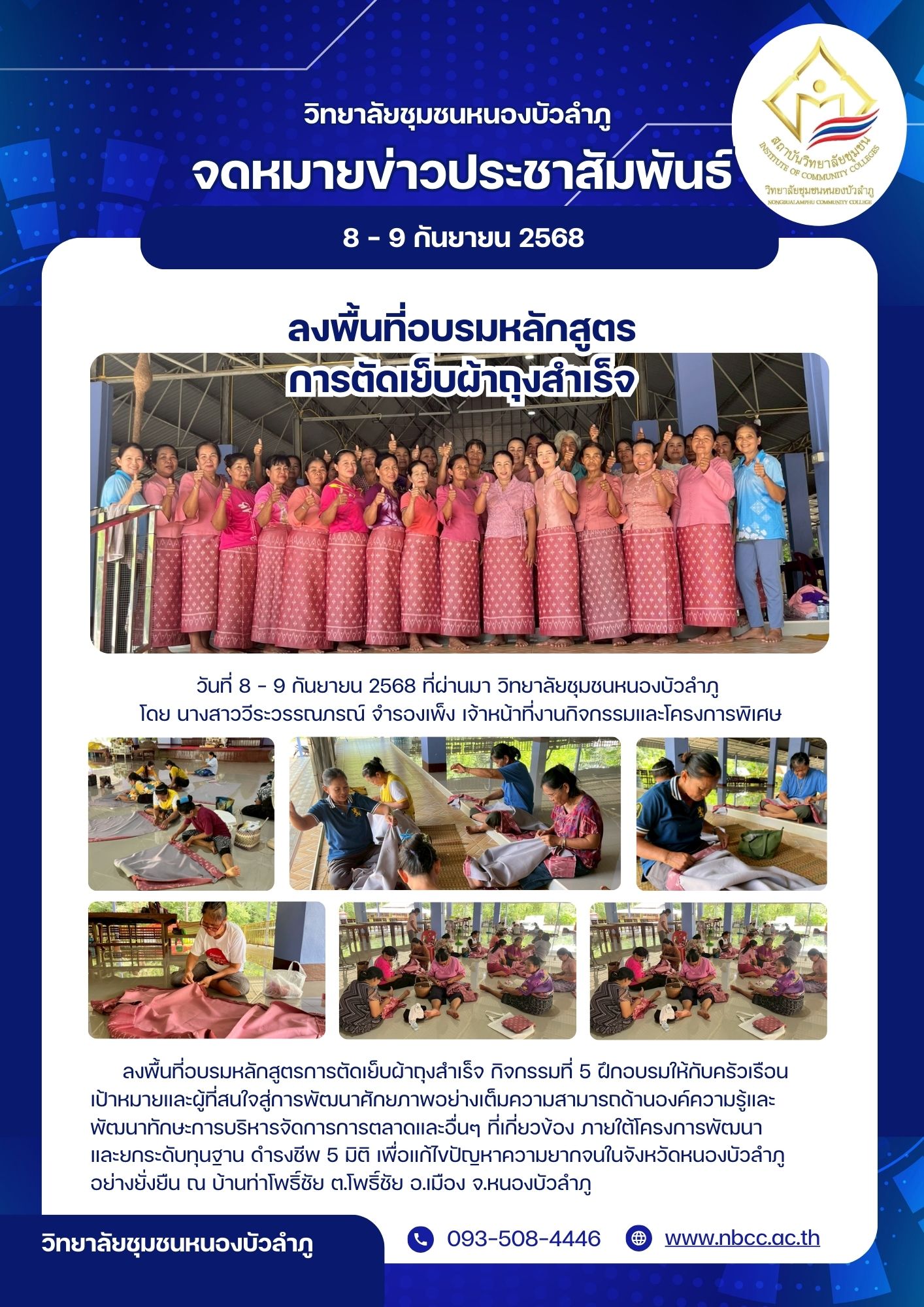 วันที่ 8 - 9 กันยายน 2568 ที่ผ่านมา วิทยาลัยชุมชนหนองบัวลำภู โดย นางสาววีระวรรณภรณ์ จำรองเพ็ง เจ้าหน้าที่งานกิจกรรมและโครงการพิเศษ ลงพื้นที่อบรมหลักสูตรการตัดเย็บผ้าถุงสำเร็จ กิจกรรมที่ 5 ฝึกอบรมให้กับครัวเรือน เป้าหมายและผู้ที่สนใจสู่การพัฒนาศักยภาพอย่างเต็มความสามารถด้านองค์ความรู้และพัฒนาทักษะการบริหารจัดการการตลาดและอื่นๆ ที่เกี่ยวข้อง ภายใต้โครงการพัฒนาและยกระดับทุนฐาน ดำรงชีพ 5 มิติ เพื่อแก้ไขปัญหาความยากจนในจังหวัดหนองบัวลำภู อย่างยั่งยืน ณ บ้านท่าโพธิ์ชัย ต.โพธิ์ชัย อ.เมือง จ.หนองบัวลำภู รายงานโดย นางสาวไอลดา กุตัน วันที่รายงาน 18/09/2568 [20006] |