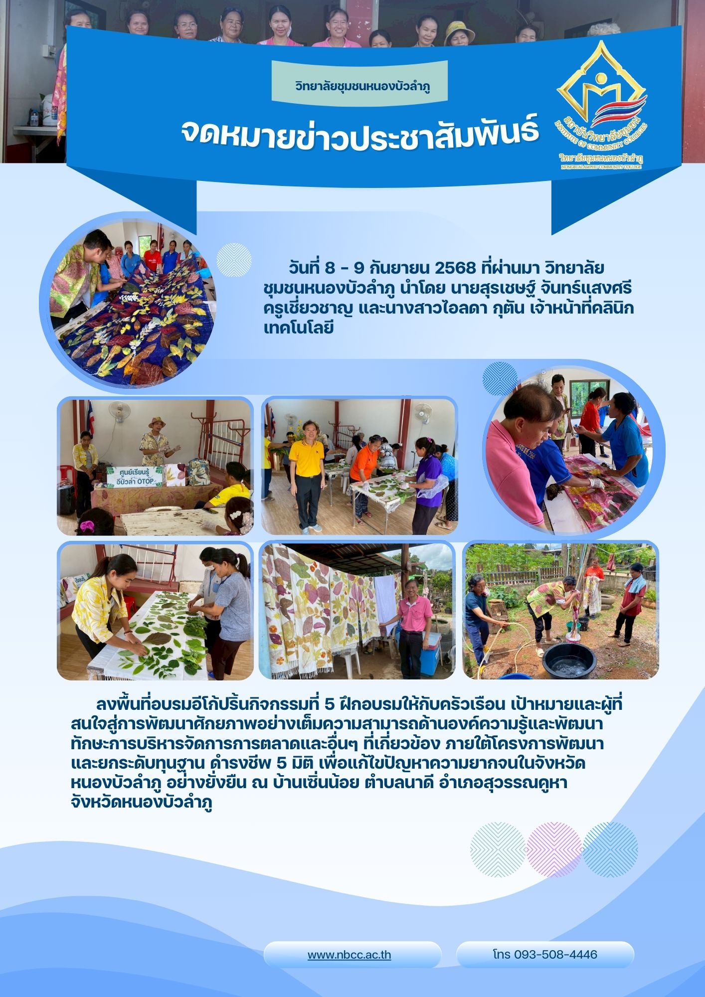 วันที่ 8 - 9 กันยายน 2568 ที่ผ่านมา วิทยาลัยชุมชนหนองบัวลำภู นำโดย นายสุรเชษฐ์ จันทร์แสงศรี ครูเชี่ยวชาญ และนางสาวไอลดา กุตัน เจ้าหน้าที่คลินิกเทคโนโลยี ลงพื้นที่อบรมอีโก้ปริ้นกิจกรรมที่ 5 ฝึกอบรมให้กับครัวเรือน เป้าหมายและผู้ที่สนใจสู่การพัฒนาศักยภาพอย่างเต็มความสามารถด้านองค์ความรู้และพัฒนาทักษะการบริหารจัดการการตลาดและอื่นๆ ที่เกี่ยวข้อง ภายใต้โครงการพัฒนาและยกระดับทุนฐาน ดำรงชีพ 5 มิติ เพื่อแก้ไขปัญหาความยากจนในจังหวัดหนองบัวลำภู อย่างยั่งยืน ณ บ้านเซิ่นน้อย ตำบลนาดี อำเภอสุวรรณคูหา จังหวัดหนองบัวลำภู รายงานโดย นางสาวไอลดา กุตัน วันที่รายงาน 18/09/2568 [20007] |