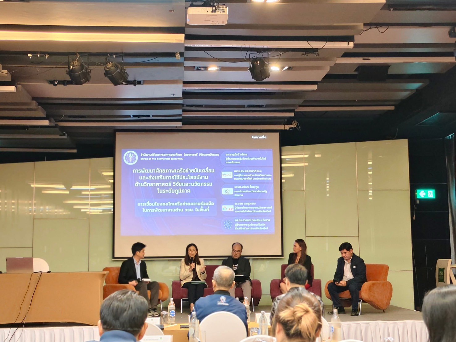 การเสวนาเรื่อง “แนวทางการเชื่อมโยงกลไกเครือข่ายความร่วมมือในการพัฒนางานด้าน ววน. ในพื้นที่” โดยมุ่งเน้นการสร้างความเข้มแข็งของเครือข่ายความร่วมมือระหว่างสถาบันการศึกษา หน่วยงานภาครัฐ ภาคเอกชน และภาคประชาสังคม เพื่อเสริมสร้างด้านวิทยาศาสตร์ วิจัย และนวัตกรรมที่ยั่งยืน ตอบสนองต่อความต้องการของพื้นที่ และเชื่อมโยงกับการพัฒนาประเทศในมิติที่กว้างขึ้น การเสวนาครั้งนี้ ดร.ชาญวิทย์ ตรีเดช ผู้อำนวยการกลุ่มส่งเสริมธุรกิจเทคโนโลยีและนวัตกรรม เป็นพีธีกรผู้ดำเนินรายการเสวนาโดยมีผู้เข้าร่วมเสวนาได้แก่