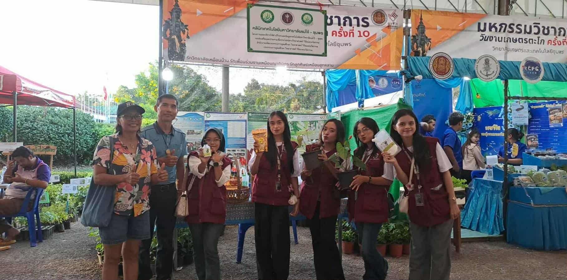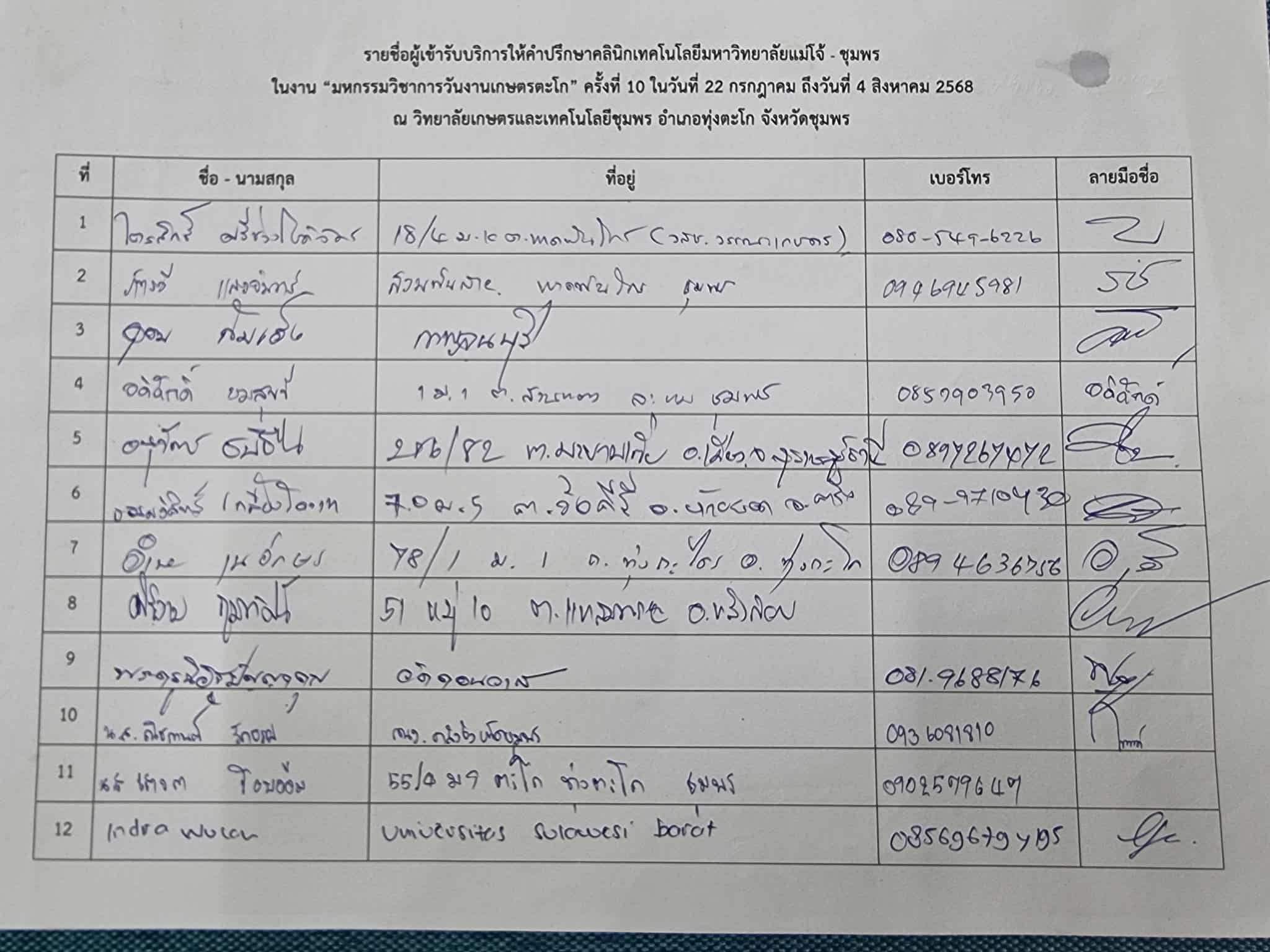 2. วันที่ 8 พฤษภาคม 2568 คลินิกเทคโนโลยีมหาวิทยาลัยแม่โจ้ - ชุมพร เข้าร่วมโครงการคลินิกเกษตรเคลื่อนที่ในพระราชานุเคราะห์ สมเด็จพระบรมโอรสาธิราชฯ สยามมกุฎราชกุมาร ในครั้งนี้คลินิกเทคโนโลยีมหาวิทยาลัยแม่โจ้ - ชุมพร แสดงนิทรรศการและบริการให้คำปรึกษาแก่เกษตรกรและผู้ที่สนใจ เช่น สารชีวภัณฑ์ในการป้องกันและกำจัดโรคและแมลง การเลี้ยงไส้เดือนดิน การผลิตปุ๋ยอินทรีย์เพื่อการผลิตพืช โดยนายชัยวิชิต เพชรศิลา หัวหน้างานบริการวิชาการและวิจัย
