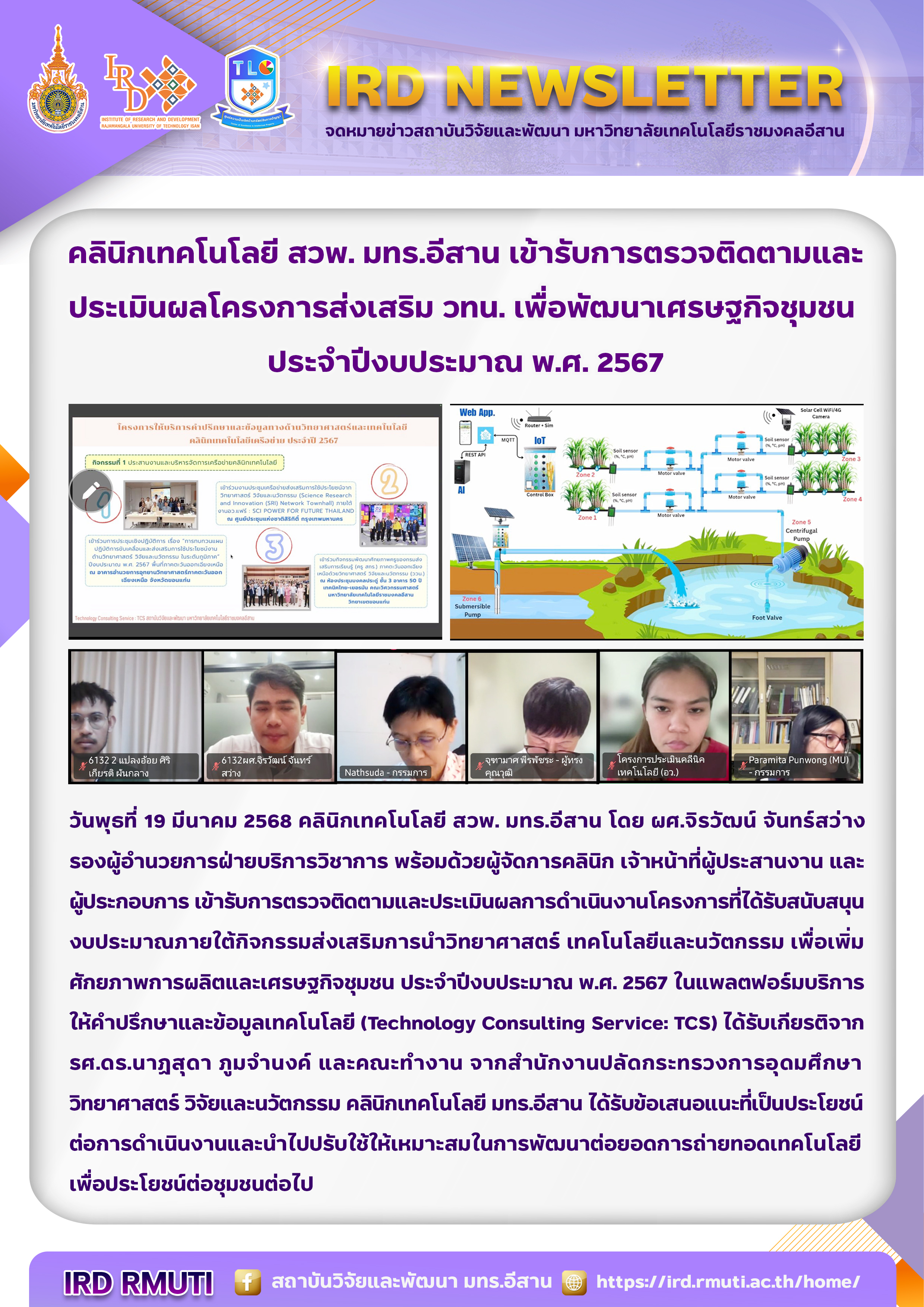 วันพุธที่ 19 มีนาคม 2568 คลินิกเทคโนโลยี สถาบันวิจัยและพัฒนา มทร.อีสาน นำโดยผู้ช่วยศาสตราจารย์จิรวัฒน์ จันทร์สว่าง ผู้จัดการคลินิก เจ้าหน้าที่ผู้ประสานงาน และผู้ประกอบการเข้ารับการตรวจติดตามและประเมินผลการดำเนินงานโครงการที่ได้รับสนับสนุนงบประมาณภายใต้กิจกรรมส่งเสริมการนำวิทยาศาสตร์ เทคโนโลยีและนวัตกรรม เพื่อเพิ่มศักยภาพการผลิตและเศรษฐกิจชุมชน ประจำปีงบประมาณ พ.ศ. ๒๕๖๗ ในแพลตฟอร์มบริการให้คำปรึกษาและข้อมูลเทคโนโลยี (Technology Consulting Service: TCS) ได้รับเกียรติจาก รองศาสตราจารย์ดร.นาฏสุดา ภูมจำนงค์ และคณะทำงาน จากสำนักงานปลัดกระทรวงการอุดมศึกษา วิทยาศาสตร์ วิจัยและนวัตกรรม คลินิกเทคโนโลยี มทร.อีสาน ได้รับข้อเสนอแนะที่เป็นประโยชน์ต่อการดำเนินงานและนำไปปรับใช้ให้เหมาะสมในการพัฒนาต่อยอดการถ่ายทอดเทคโนโลยี เพื่อประโยชน์ต่อชุมชนต่อไป รายงานโดย นางสาวจันทร์สุดา เจ็กมะดัน วันที่รายงาน 30/09/2568 [20785] |