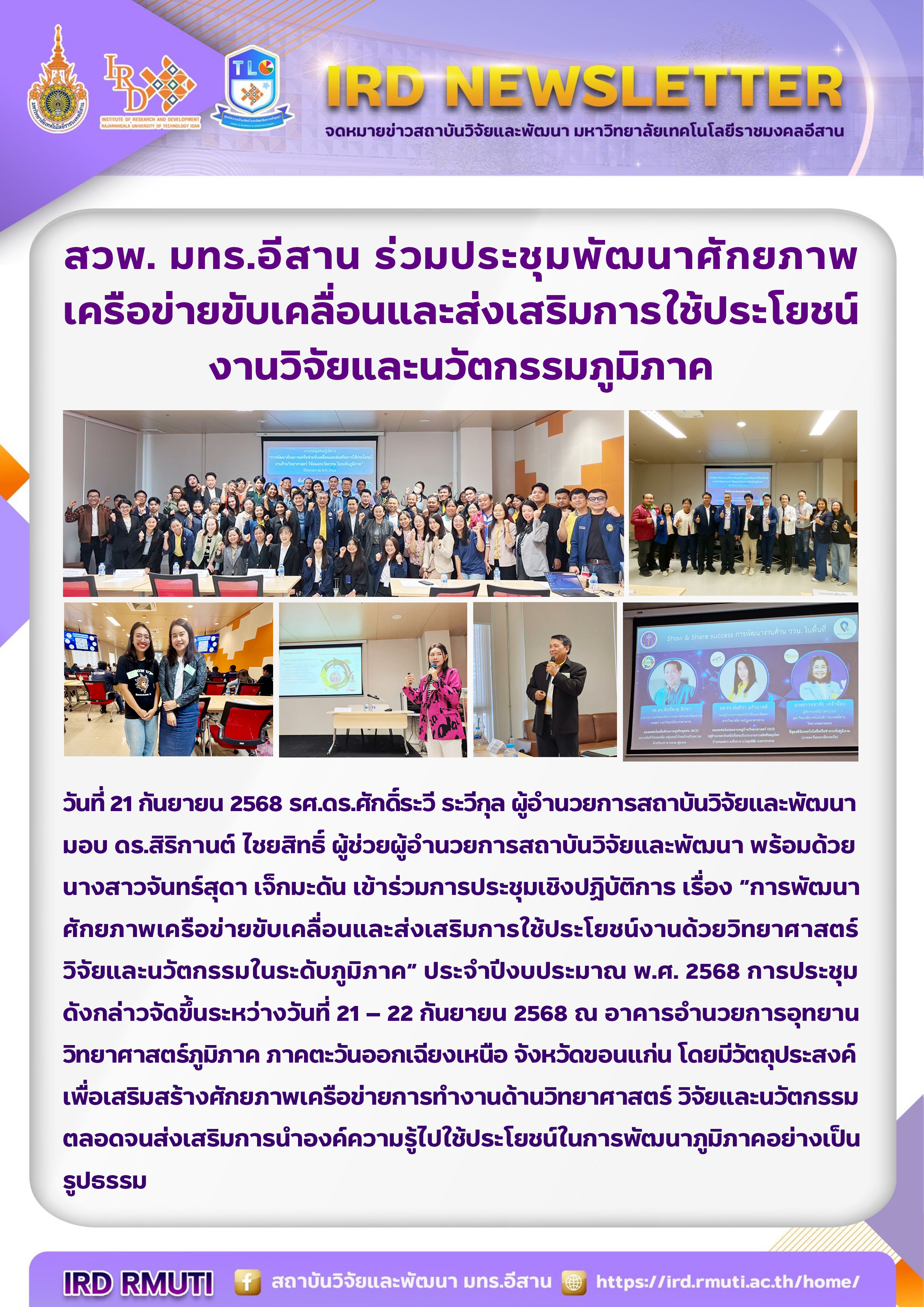 งานคลินิกเทคโนโลยี สถาบันวิจัยและพัฒนา นครราชสีมา นำโดย ดร.สิริกานต์ ไชยสิทธิ์ ผู้ช่วยผู้อำนวยการสถาบันวิจัยและพัฒนา พร้อมด้วย นางสาวจันทร์สุดา เจ็กมะดัน เข้าร่วมการประชุมเชิงปฏิบัติการ เรื่อง “การพัฒนาศักยภาพเครือข่ายขับเคลื่อนและส่งเสริมการใช้ประโยชน์งานด้วยวิทยาศาสตร์วิจัยและนวัตกรรมในระดับภูมิภาค” ประจำปีงบประมาณ พ.ศ. 2568 การประชุมดังกล่าวจัดขึ้นระหว่างวันที่ 21 – 22 กันยายน 2568 ณ อาคารอำนวยการอุทยานวิทยาศาสตร์ภูมิภาค ภาคตะวันออกเฉียงเหนือ จังหวัดขอนแก่น โดยมีวัตถุประสงค์เพื่อเสริมสร้างศักยภาพเครือข่ายการทำงานด้านวิทยาศาสตร์ วิจัยและนวัตกรรม ตลอดจนส่งเสริมการนำองค์ความรู้ไปใช้ประโยชน์ในการพัฒนาภูมิภาคอย่างเป็นรูปธรรม รายงานโดย นางสาวจันทร์สุดา เจ็กมะดัน วันที่รายงาน 30/09/2568 [20801] |