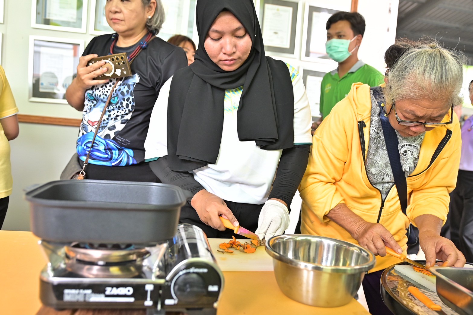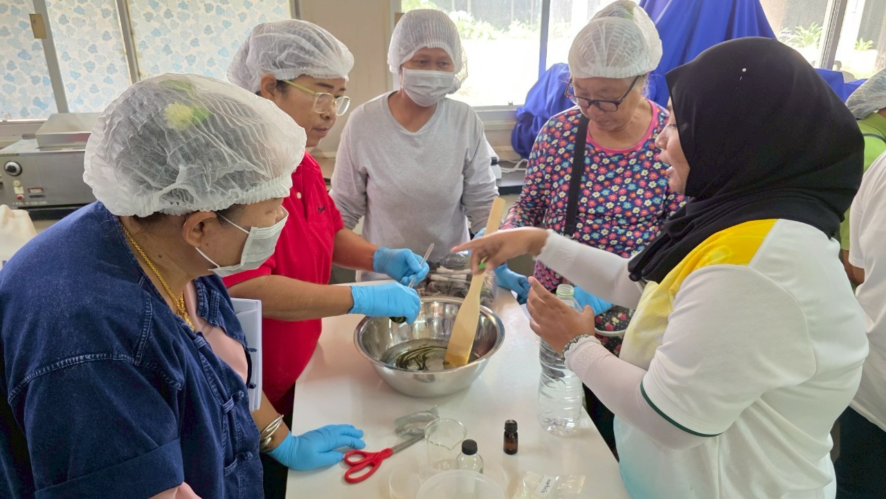 วิทยากร โดย ดร.ศศิวิมล จันทร์สุเทพ นักวิจัย หน่วยการใช้ประโยชน์จากผลิตภัณฑ์ธรรมชาติ ศูนย์ปฏิบัติการวิจัยและเรือนปลูกพืชทดลอง ผู้เข้าอบรมได้ฝึกปฏิบัติการผลิตสบู่เหลวสมุนไพรผสมสารสกัดพญายอ สามารถนำไปพัฒนาต่อยอดเป็นผลิตภัณฑ์เชิงพาณิชย์เพื่อสร้างมูลค่าเพิ่มให้แก่สมุนไพรที่ปลูกโดยวิสาหกิจชุมชนฯ