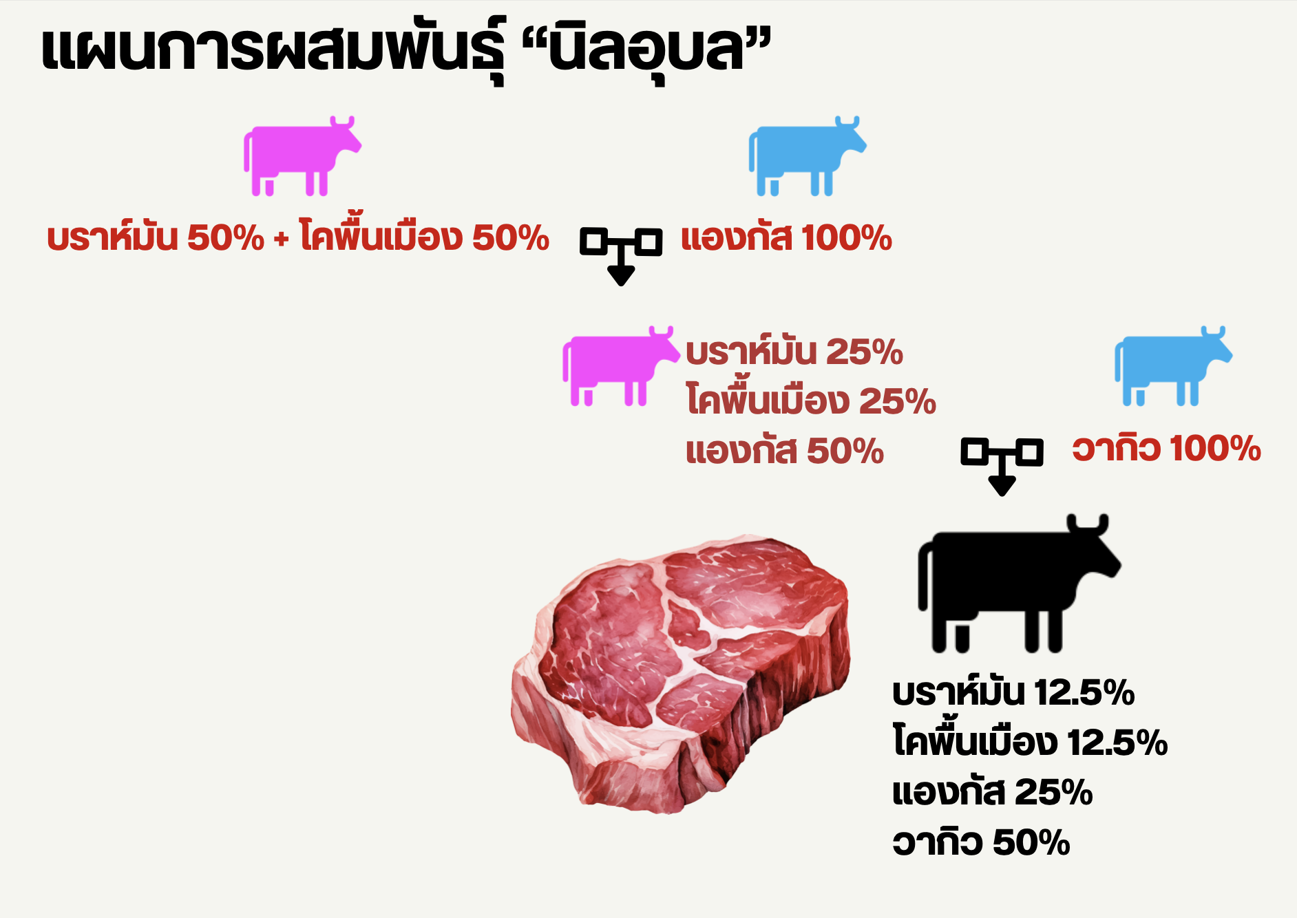 “โคนิลอุบล”เป็นการวางแผนผสมพันธุ์หลายสายพันธุ์ โดยปัจจุบันใช้แม่ไทยบราห์มันเลือดผสมที่มีอยู่เดิมของเกษตรกร เป็นรุ่นยาย และใช้พ่อพันธุ์แองกัสเลือดร้อย เป็นรุ่นตา เพื่อให้ได้ลูกผสมไทยบราห์มันและแองกัสเลือดผสมที่มีโครงสร้างใหญ่และแข็งแรงทนต่อสภาพอากาศ จากนั้นใช้น้ำเชื้อโคพันธุ์วากิวเป็นสายพ่อ เพื่อให้ได้ลูกผสมสายเลือดไทยบราห์มันแองกัสและวากิว เพื่อให้เกิดไขมันแทรกในกล้ามเนื้อ มุ่งให้เป็นเนื้อเกรดพรีเมียมที่เป็นโคอัตลักษณ์ของเกษตรกรกลุ่มเครือข่าย กลุ่มเครือข่ายโคนิลอุบล ส่งเสริมให้เกษตรกรในชุมชนต่าง ๆ เลี้ยงโคแม่พันธุ์เพื่อผลิตลูกโดยให้ขึ้นทะเบียนแม่พันธุ์ มีเป้าหมายสร้างต้นแบบ อำเภอละ 10 ครอบครัว ๆ ละ 12 ตัว รวม 3,000 ตัวต่อปี เพื่อผลิตลูกโคให้ได้ 1,500 ตัวต่อปี ลูกเพศผู้นำเข้าขุน 700 ตัวต่อปี ส่วนลูกเพศเมียคัดเป็นแม่พันธุ์ต่อไป อย่างไรก็ตามพบว่า ที่ผ่านมาเกษตรกรสมาชิกไม่มีข้อมูลลูกโคที่เกิดจากแม่พันธุ์ที่ดี ขาดการทำประวัติตั้งแต่รุ่นตายาย ไม่มีข้อมูลสายพันธุ์ของแม่พันธุ์ ทำให้รุ่นลูกมีข้อมูลสายพันธุ์ไม่สมบูรณ์ ไม่สามารถนำไปประกอบการตัดสินใจในการนำโคเข้าขุน จึงมีโอกาสเสี่ยงต่อการขาดทุน โครงการนี้ได้ปรับเปลี่ยนการใช้น้ำเชื้อพ่อพันธุ์ที่มีจีโนไทป์ TT โดยใช้เทคนิค Real-time PCR ในการตรวจสอบน้ำเชื้อที่มียีนที่ควบคุมการสร้างไขมันแทรกเนื้อ ยีนThyroglobulin (TG) ที่บริเวณส่วน 5-UTR ที่เรียกว่า ยีน TG5ซึ่งจะพบว่าดีเอ็นเอมีการเปลี่ยนแปลงชนิดของเบสหนึ่งตำแหน่ง (Single nucleotide polymorphism; SNP) ณ ตำแหน่งที่ 22จากเบส C (Cytosine) เป็น T (Thymine) จึงทำให้เกิดจีโนไทป์ได้ 3ลักษณะ ได้แก่ TT CT และ CC ซึ่งมีรายงานว่าเป็นลักษณะพันธุกรรมที่มีผลต่อการมีไขมันแทรกสูง ไขมันแทรกปานกลาง และไม่มีไขมันแทรก ตามลำดับ ส่งเสริมการเลือกน้ำเชื้อเฉพาะพ่อพันธุ์ที่มีจีโนไทป์ TT พันธุ์แท้ (Full blood) เพื่อเพื่อผลิตลูก F1 F2และ F3ต่อไป ส่งเสริมให้เกษตรกรให้ความสำคัญด้านโภชนาการ โดยมุ่งเป้าจัดการอาหาร 2ระยะ ได้แก่ ระยะก่อนคลอดและหลังคลอด โดยโคทุกตัวจะมีการบันทึกการผสมพันธุ์และผลการตรวจท้อง ด้วยแอปพลิเคชัน “เซียนบีฟ” เพื่อให้แอปพลิเคชันเตือนให้เตรียมการคลอดล่วงหน้าก่อนคลอด 2เดือน เกษตรกรจะต้องให้อาหารโคสูตรก่อนคลอดตามโภชนาการที่ต้องการ และให้ปริมาณอาหารอย่างเหมาะสมอย่างน้อย 5-6%ของน้ำหนักตัวต่อวัน วิเคราะห์ค่าคะแนนร่างกาย (Body condition score, BCS) เก็บข้อมูลในแอปพลิเคชัน“เซียนบีฟ” เมื่อมีการคลอด แอปพลิเคชัน“เซียนบีฟ” จะแจ้งเตือนการเป็นสัดหลังคลอด ให้เกษตรกรบันทึกการผสมพันธุ์และกา