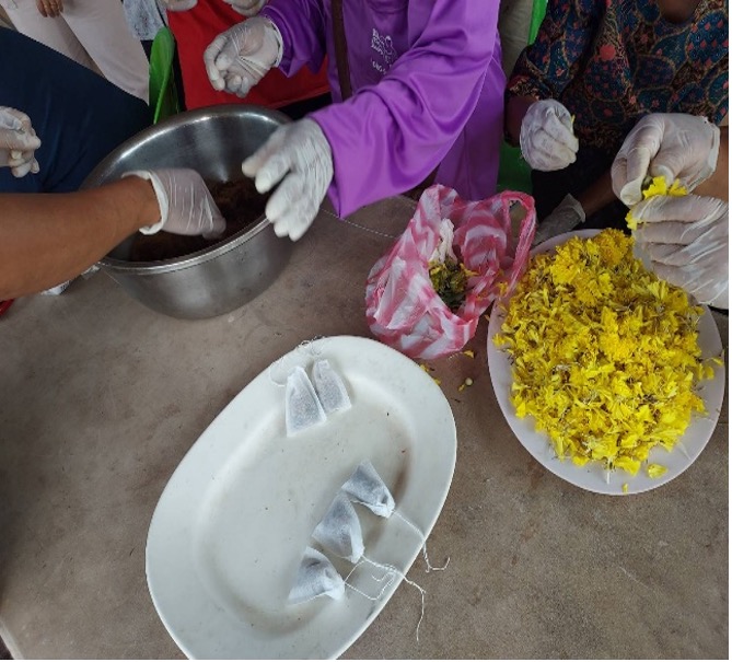 กิจกรรมที่ 4 ออกแบบผลิตภัณฑ์ชาข้าวเม่าและผลพลอยได้ผสมสมุนไพร โดยอยู่ในระหว่างการพัฒนาผลิตภัณฑ์ชาข้าวเม่า และรอจัดซื้อวัสดุเพื่อพัฒนาผลิตภัณฑ์ จำนวน 20,000 บาท