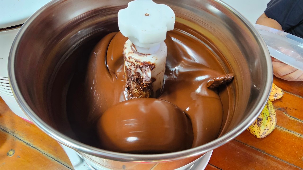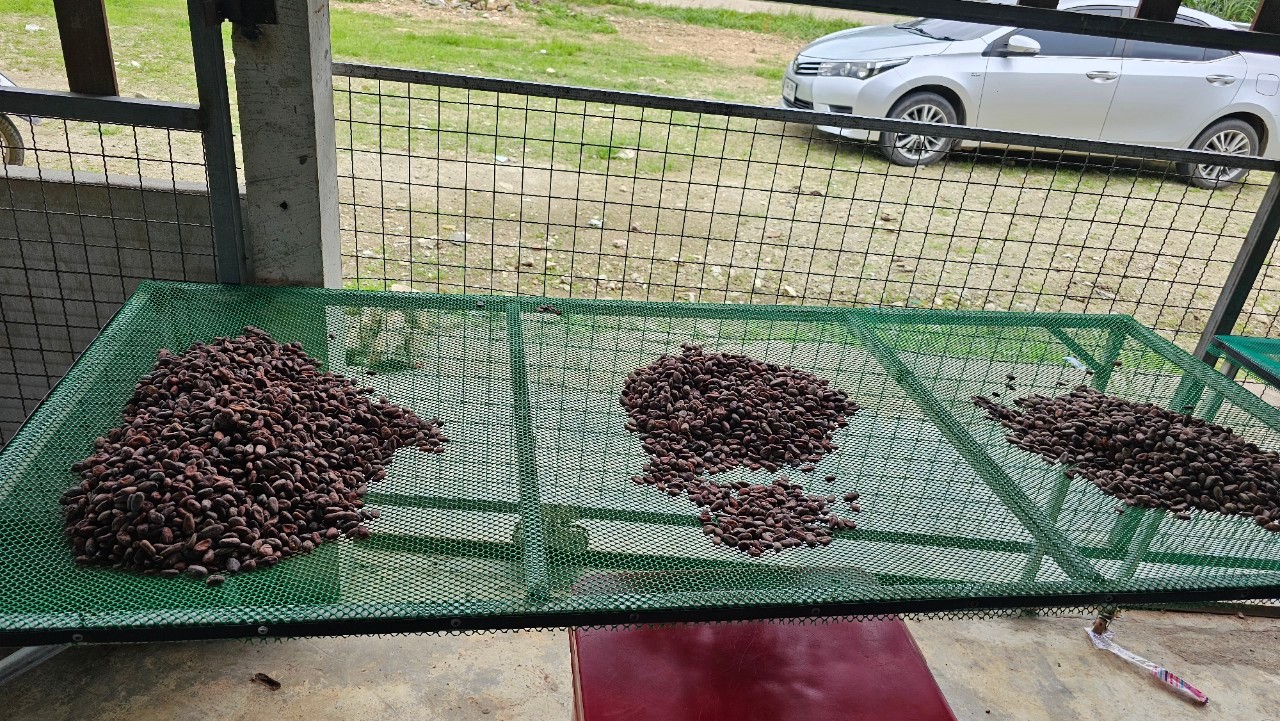 รายงานความก้าวหน้า การส่งเสริมการนำวิทยาศาสตร์ เทคโนโลยี และนวัตกรรมเพื่อเพิ่มศักยภาพธุรกิจชุมชน (Building Community Enterprise: BCE) ประจำปี 2568 โครงการ การพัฒนาผลิตภัณฑ์จากเมล็ดโกโก้สู่ผลิตภัณฑ์ซูเปอร์ฟู้ดมูลค่าสูง การดำเนินงานตามวัตถุประสงค์ของโครงการ ในไตรมาส 4 ได้ผลการดำเนินงาน ดังนี้ 1. เพื่อพัฒนามาตรฐานวัตถุดิบ การคัดเลือกวัตถุดิบสู่การแปรรูป ศึกษากระบวนการคั่วเมล็ดโกโก้ให้ได้รสชาติที่เหมาะสม และคงสารต้านอนุมูลอิสระให้คงอยู่สูงสุด 2. เพื่อพัฒนาผลิตภัณฑ์จากโกโก้อย่างน้อย 3 ผลิตภัณฑ์ต่อปี พร้อมสร้างผลิตภัณฑ์ต้นแบบ