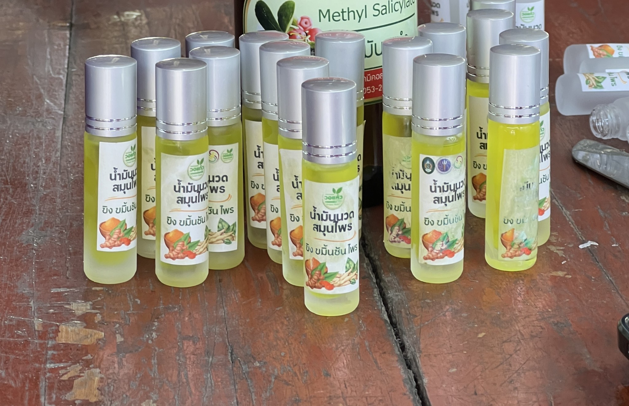 รายงานความก้าวหน้า ไตรมาสที่ 2-4 กิจกรรมที่ 1 การพัฒนาผลิตภัณฑ์สมุนไพร กลุ่มเวชสำอางแตกต่างจากที่มีอยู่เดิม เพื่อเพิ่มความโดดเด่นของผลิตภัณฑ์และดำเนินการถ่ายทอดเทคโนโลยี ทำการลงพื้นที่กับกลุ่มวิวสาหกิจชุมชนในการในการคัดเลือกผลิตภัณฑ์ที่ต้องการพัฒนา เพื่อเพิ่มความโดดเด่นของผลิตภัณฑ์ โดยประชุมกับสมาชิก พบว่า ผลิตภัณฑ์ที่ผลิตและสามารถจำหน่ายได้ ได้แก่ กลุ่มผลิตภัณฑ์น้ำมันนวดสมุนไพร (น้ำมันนวดไพล) แบบสเปร์ และแบบลูกกลิ้ง ยาหม่องน้ำสมุนไพร ซึ่งทางกลุ่มได้มีการประสานงานกับทาง รพ.สต. วอแก้ว ในการใช้กับคลินิกแพทย์แผนไทย จึงได้วางแผนในการพัฒนาเข้าสู่มาตรฐาน และดำเนินการส่งตรวจคุณภาพและขอเลขที่จดแจ้ง เพื่อที่จะได้ดำเนินกิจกรรรมอื่นต่อไปเช่น ประเมินคุณภาพของผลิตภัณฑ์ และดำเนินการเข้าสู่มาตรฐาน และขยายแพลตฟอร์มออนไลน์ (เว็บไซต์หรือแอพพลิเคชันบนสมาร์ทโฟนที่ทางกลุ่มใช้ได้จริง)