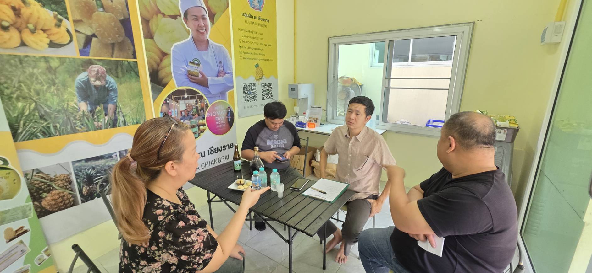 2.1 กิจกรรมพัฒนานวัตกรรมสินค้าและกระบวนการผลิต การขยายสายผลิตภัณฑ์จากฐานทรัพยากรชุมชน รายละเอียดการดำเนินงาน กิจกรรมพัฒนานวัตกรรมสินค้าและกระบวนการผลิต การขยายสายผลิตภัณฑ์จากฐานทรัพยากรชุมชน เป็นกิจกรรมต่อยอดจากปีที่ 1 ที่มุ่งเน้นการพัฒนาผลิตภัณฑ์ใหม่และการเพิ่มประสิทธิภาพกระบวนการผลิต โดยใช้ทรัพยากรท้องถิ่นเป็นฐานในการพัฒนา เพื่อสร้างมูลค่าเพิ่มให้กับผลิตภัณฑ์สุรากลั่นและน้ำส้มสายชูหมักจากสับปะรด GI จังหวัดเชียงราย การดำเนินกิจกรรมได้รับความร่วมมือจากทีมผู้เชี่ยวชาญจากห้องปฏิบัติการสาขาวิชาวิทยาศาสตร์การอาหาร มหาวิทยาลัยราชภัฏเชียงราย นำโดย ผู้ช่วยศาสตราจารย์ ดร.นุกุล อินทกูล พร้อมทีมบุคลากรผู้เชี่ยวชาญ คุณสุรินทร์ บุญทราย และคุณชิษณุพงค์ บรรจง รวมถึงผู้เชี่ยวชาญจากบริษัท ฮัก ณ ภูแล เชียงราย จำกัด ซึ่งเป็นพันธมิตรหลักในการพัฒนาและผลิต ร่วมเป็นวิทยากรให้คำแนะนำแก่ผู้เข้าร่วม จำนวน 12 คน จากกลุ่มวิสาหกิจชุมชน หัวข้อในการพัฒนานวัตกรรม 1. การพัฒนาสายผลิตภัณฑ์ใหม่ 1.1 การพัฒนาสูตรสุรากลั่นสับปะรดแบบ Premium ที่มีดีกรี 35% และ 40% 1.2 การพัฒนาน้ำส้มสายชูหมักสับปะรดสูตรเข้มข้น สำหรับการปรุงอาหาร 2. การพัฒนากระบวนการผลิต 2.1 การปรับปรุงกระบวนการหมักเพื่อเพิ่มประสิทธิภาพและลดเวลาการผลิต 2.2 การพัฒนาระบบการกลั่นแบบ 2 ขั้นตอน เพื่อเพิ่มความบริสุทธิ์ของผลิตภัณฑ์ 2.3 การปรับปรุงกระบวนการกรองและการบ่มสุรา 2.4 การพัฒนาระบบควบคุมอุณหภูมิในกระบวนการผลิต 3. การใช้ทรัพยากรท้องถิ่นเพิ่มเติม 3.1 การทดลองใช้สมุนไพรท้องถิ่นในการปรุงแต่งกลิ่นและรส 3.2 การใช้วัสดุบรรจุภัณฑ์จากท้องถิ่น (ไม้ไผ่ หวาย) 3.3 การพัฒนาบรรจุภัณฑ์ที่เป็นมิตรกับสิ่งแวดล้อม การฝึกปฏิบัติ ฝึกปฏิบัติการพัฒนาสูตรผลิตภัณฑ์ใหม่ ทดลองกระบวนการผลิตแบบใหม่ที่พัฒนาขึ้น การทดสอบคุณภาพผลิตภัณฑ์ด้วยเครื่องมือวิเคราะห์ การประเมินทางประสาทสัมผัส (Sensory Evaluation) ผลการดำเนินกิจกรรม 1) จากการดำเนินกิจกรรมพัฒนานวัตกรรมสินค้าและกระบวนการผลิตพบว่าการดำเนินงานประสบความสำเร็จในการพัฒนาผลิตภัณฑ์ใหม่และปรับปรุงกระบวนการผลิตแม้จะมีความท้าทายจากปัญหาวัตถุดิบสับปะรด GI ที่ขาดแคลนในช่วงแรก 2) ด้านการพัฒนาผลิตภัณฑ์ ทีมวิจัยและผู้เข้าร่วมสามารถพัฒนาสูตรผลิตภัณฑ์ใหม่ ประกอบด้วย สุรากลั่นสับปะรด Premium 30% และ 40%, น้ำส้มสายชูหมักสับปะรดสูตรเข้มข้น เพื่อดำเนินการทดสอบคุณสมบัติทางกายภาพ เคมี และประสาทสัมผัสในลำดับต่อไป 3) ดำเนินการสร้างเครือข่ายเกษตรกรผู้ปลูกสับปะรด GI ในพื้น