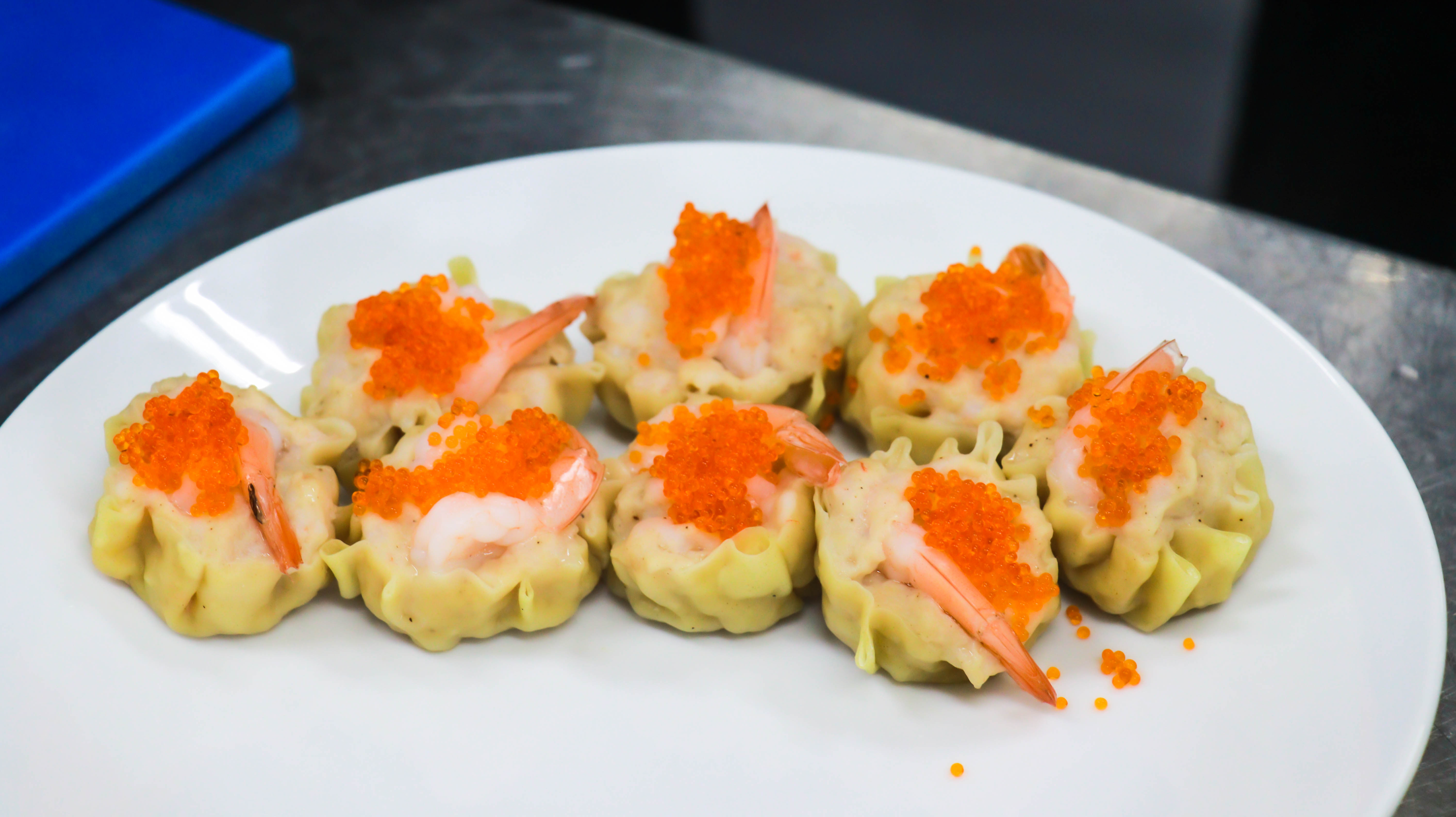 5. นึ่งขนมจีบด้วยไฟกลาง 6-9 นาที ตักไข่กุ้งโรยหน้า เพิ่มเล็กน้อย จัดเสิร์ฟกับซอสเปรี๊ยว