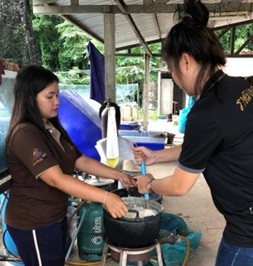 กิจกรรมที่ 2จัดฝึกอบรมและถ่ายทอดองค์ความรู้การยกระดับการผลิตอาหารปลาต้นทุนต่ำที่มีคุณค่าทางโภชนาการที่เหมาะสมต่อการเจริญเติบโตของปลาหมอตาล และเทคนิคการเลี้ยงการให้อาหาร เพื่อลดระยะเวลาในการเลี้ยงให้สั้น ในภาคปฏิบัติ ณ ชุมชนชีววิถีบ้านไผ่ขอดอน ตำบลไผ่ขอดอน อำเภอเมือง จังหวัดพิษณุโลก จำนวนผู้รับบริการ : 50 คน งบประมาณที่ใช้ : 75,800 บาท วิทยากร : คุณภาณุเดช สุโกมล : คุณเนติ บุญกลั่นสอน : ผศ.จารวี เลิกสายเพ็ง : อาจารย์ประวัติ ปรางสุรางค์ ผลการดำเนินงาน : สมาชิกเกษตรกรไม่เพียงแต่ได้รับความรู้ด้านทฤษฎีเกี่ยวกับการผลิตอาหารปลาที่มีต้นทุนต่ำและมีคุณค่าทางโภชนาการเท่านั้น แต่ยังได้ฝึกปฏิบัติจริงในการจัดทำสูตรอาหารปลาหมอตาล ตั้งแต่การคัดเลือกวัตถุดิบท้องถิ่น เช่น รำข้าว ปลายข้าว กากถั่วเหลือง กากมะพร้าว รวมถึงวัตถุดิบโปรตีนจากธรรมชาติที่หาได้ง่ายในชุมชน เช่น ไส้เดือน ปลาเป็ด หรือเศษเหลือจากการเกษตรและการประมง นำมาผ่านกระบวนการผสมตามสัดส่วนที่เหมาะสมเพื่อให้ได้คุณค่าทางโภชนาการครบถ้วน เกษตรกรได้เรียนรู้การใช้เครื่องมือและอุปกรณ์ที่จำเป็น เช่น เครื่องบด เครื่องผสม และเครื่องอัดเม็ด เพื่อผลิตอาหารเม็ดขนาดที่เหมาะสมกับช่วงวัยของปลาหมอตาล พร้อมทั้งการทดลองให้อาหารที่ผลิตขึ้นจริงกับปลาในบ่อเลี้ยง เพื่อสังเกตการกินอาหาร การเจริญเติบโต และสุขภาพของปลา นอกจากนี้ เกษตรกรยังสามารถประยุกต์สูตรอาหารให้สอดคล้องกับวัตถุดิบที่มีอยู่ตามฤดูกาลหรือตามความพร้อมในพื้นที่ เช่น การปรับสัดส่วนโปรตีนจากพืชและสัตว์ให้เหมาะสมกับราคาตลาด เพื่อลดต้นทุนการผลิตโดยไม่กระทบต่อคุณภาพของอาหารปลา รวมถึงการพัฒนาสูตรอาหารเสริมที่มีสมุนไพรท้องถิ่น เพื่อช่วยเสริมภูมิคุ้มกันและลดการใช้สารเคมี ผลจากการเรียนรู้เชิงปฏิบัติและการทดลองใช้จริง ทำให้เกษตรกรสามารถปรับใช้สูตรอาหารเหล่านี้ได้อย่างเหมาะสมกับสภาพฟาร์มของตนเอง เกิดทักษะในการผลิตอาหารปลาใช้เอง ลดการพึ่งพาอาหารสำเร็จรูปจากท้องตลาด ช่วยลดต้นทุนการเลี้ยง เพิ่มผลผลิต และทำให้สามารถนำความรู้ไปต่อยอดเพื่อสร้างรายได้ที่มั่นคงและยั่งยืน
